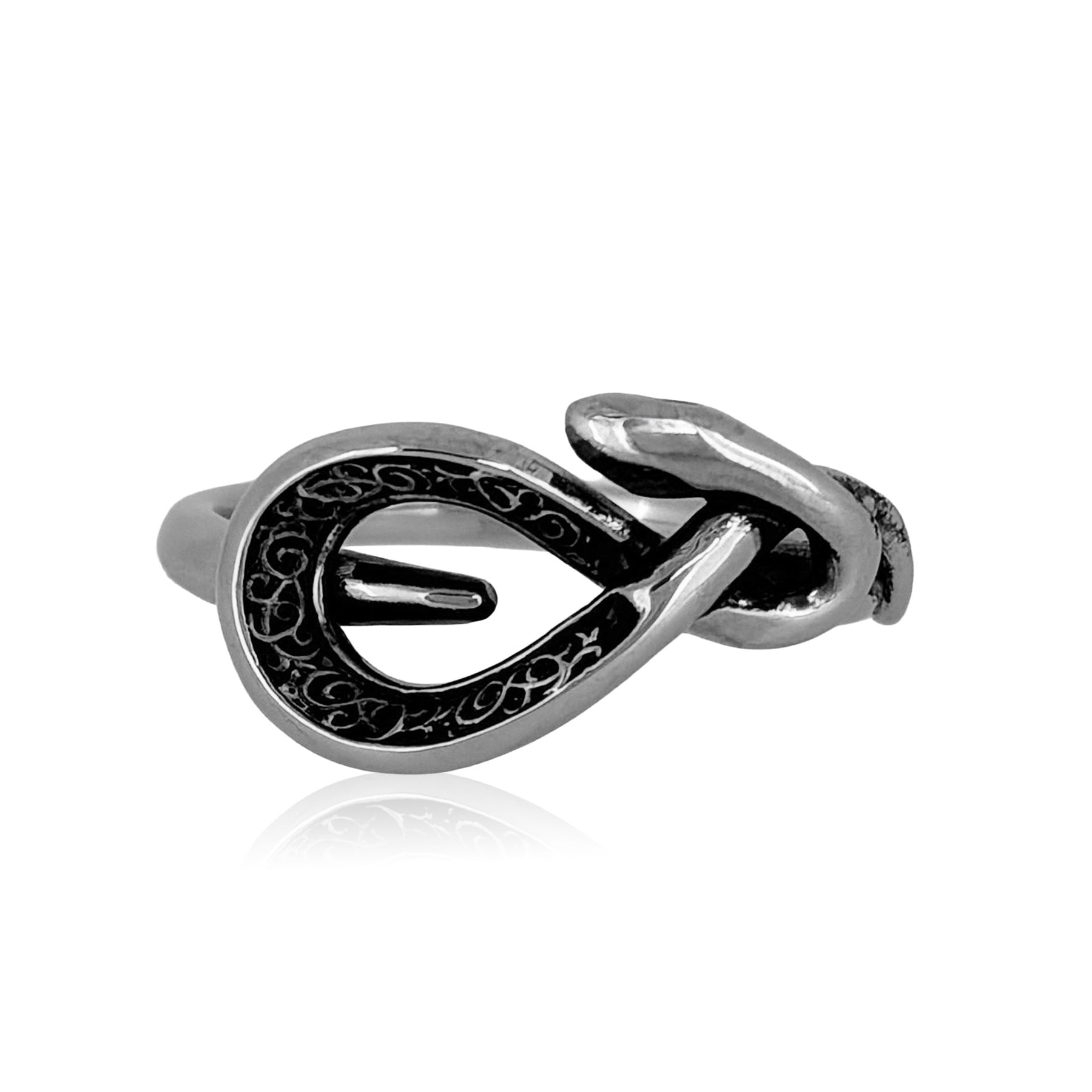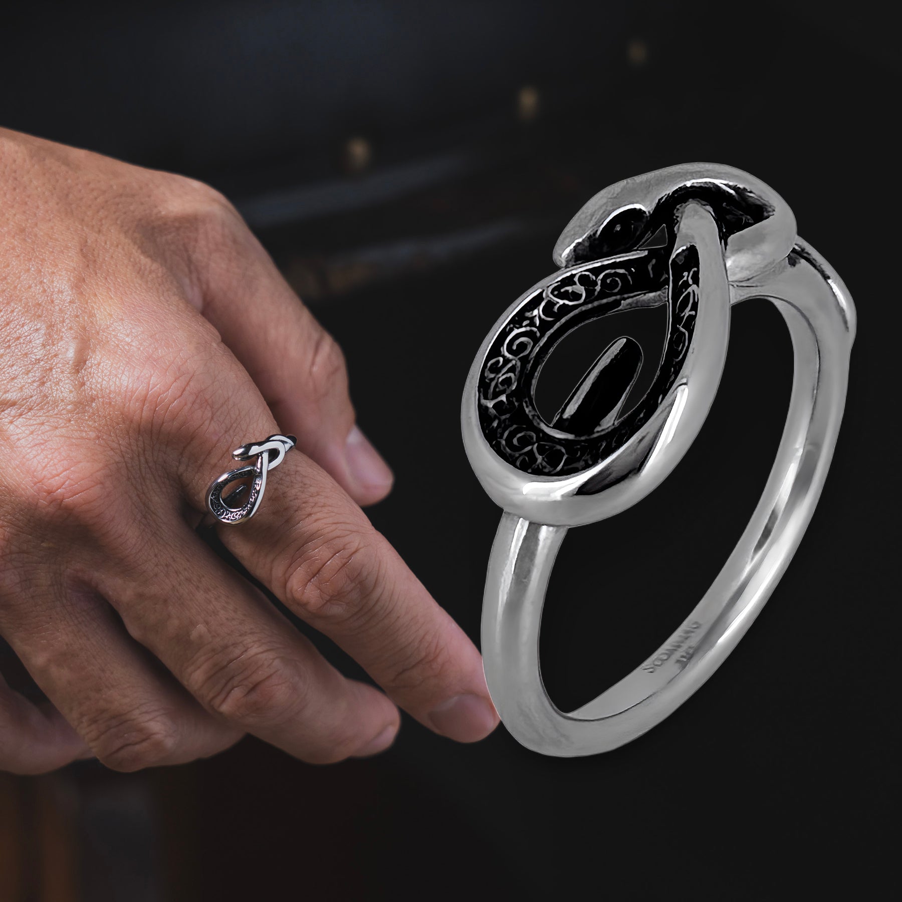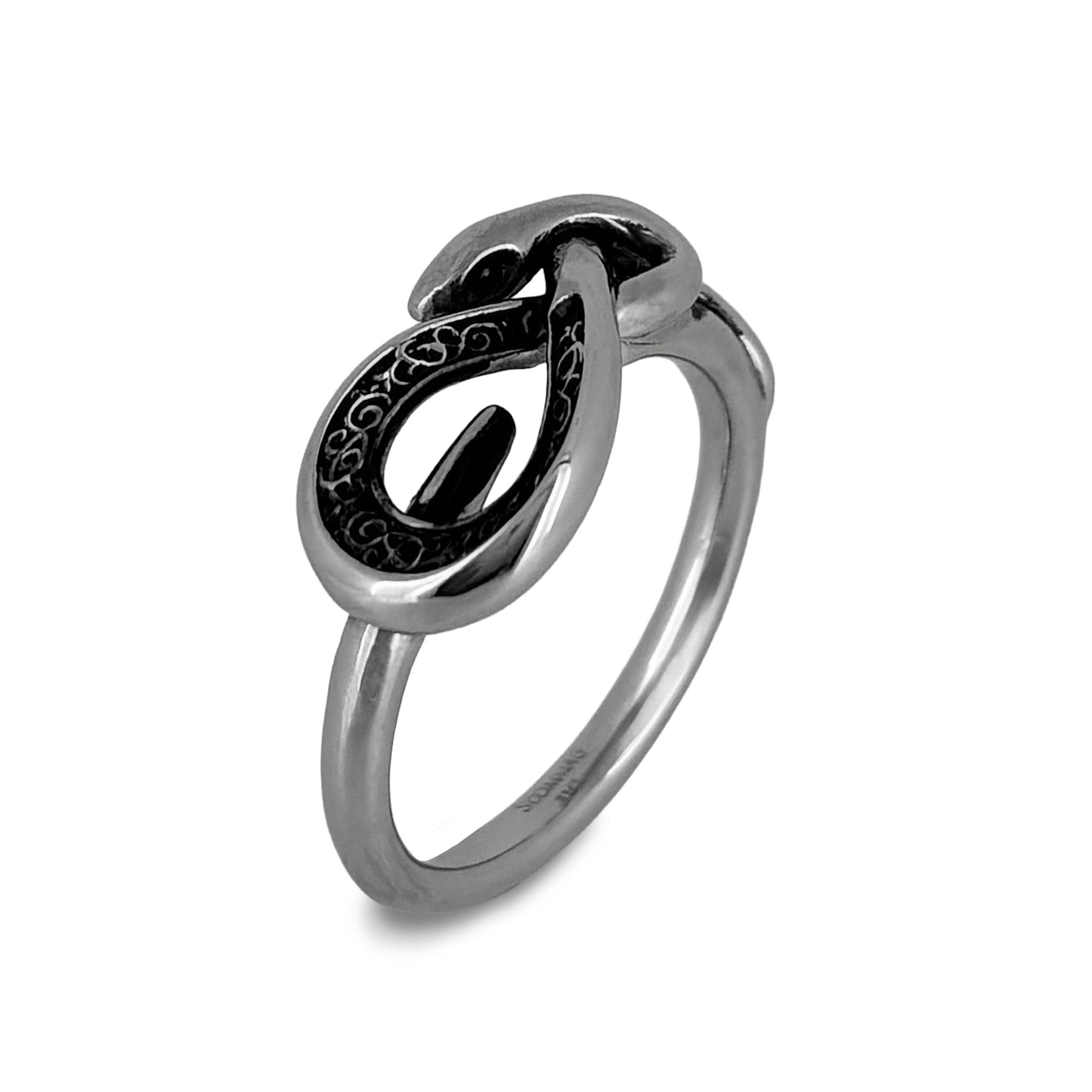 絡み合うように造形されたスネークモチーフを、クラシックな唐草模様と組み合わせたシルエットリング。