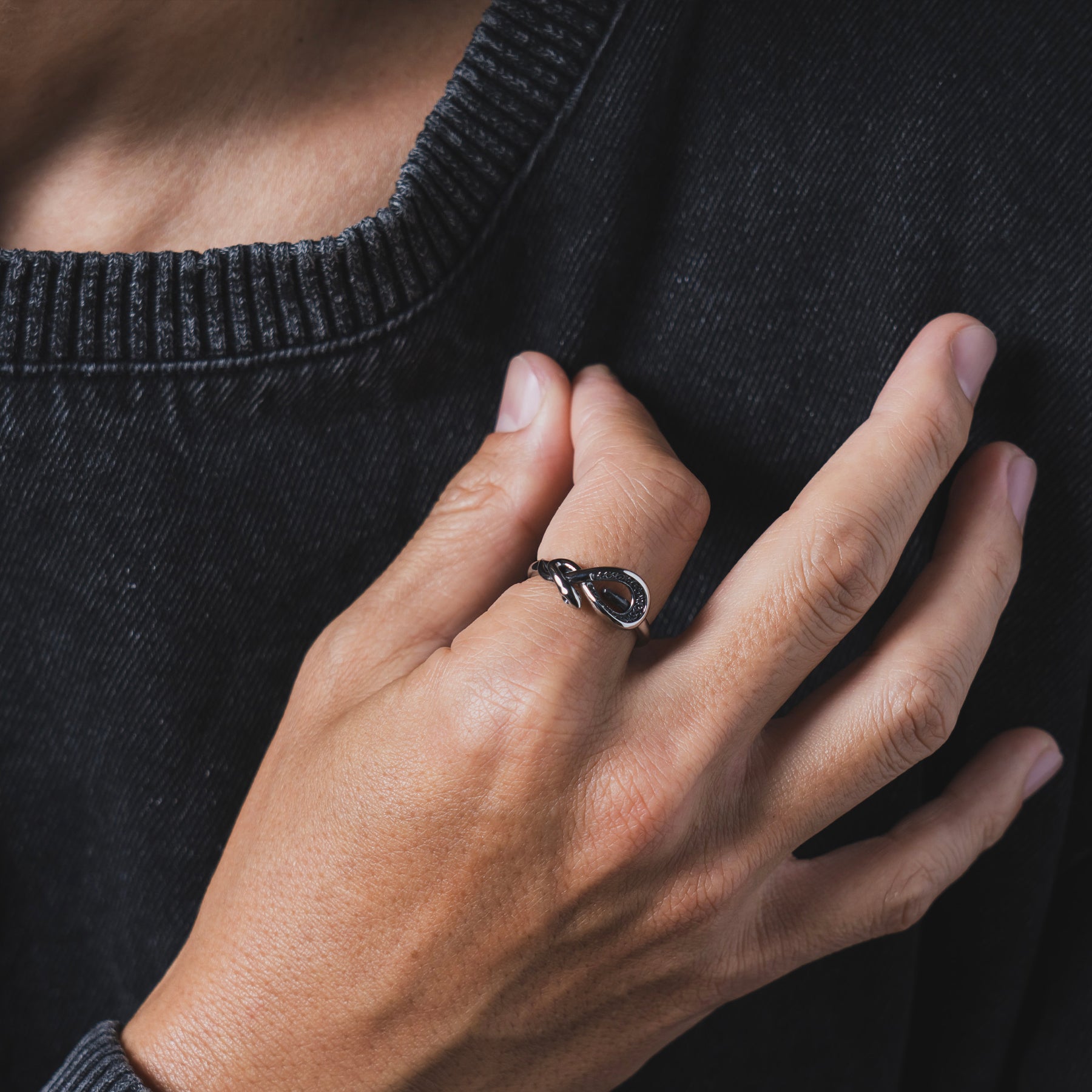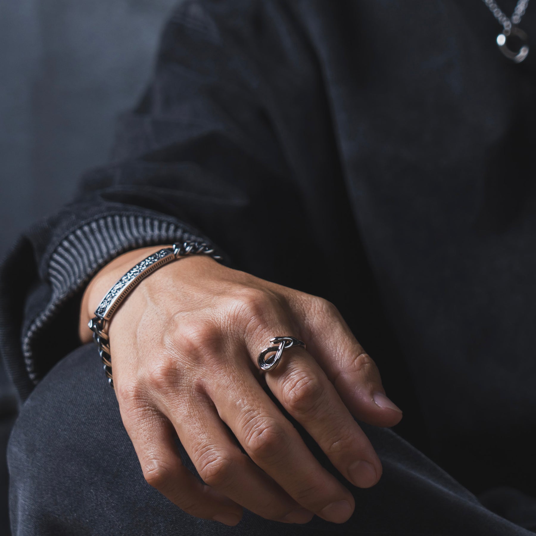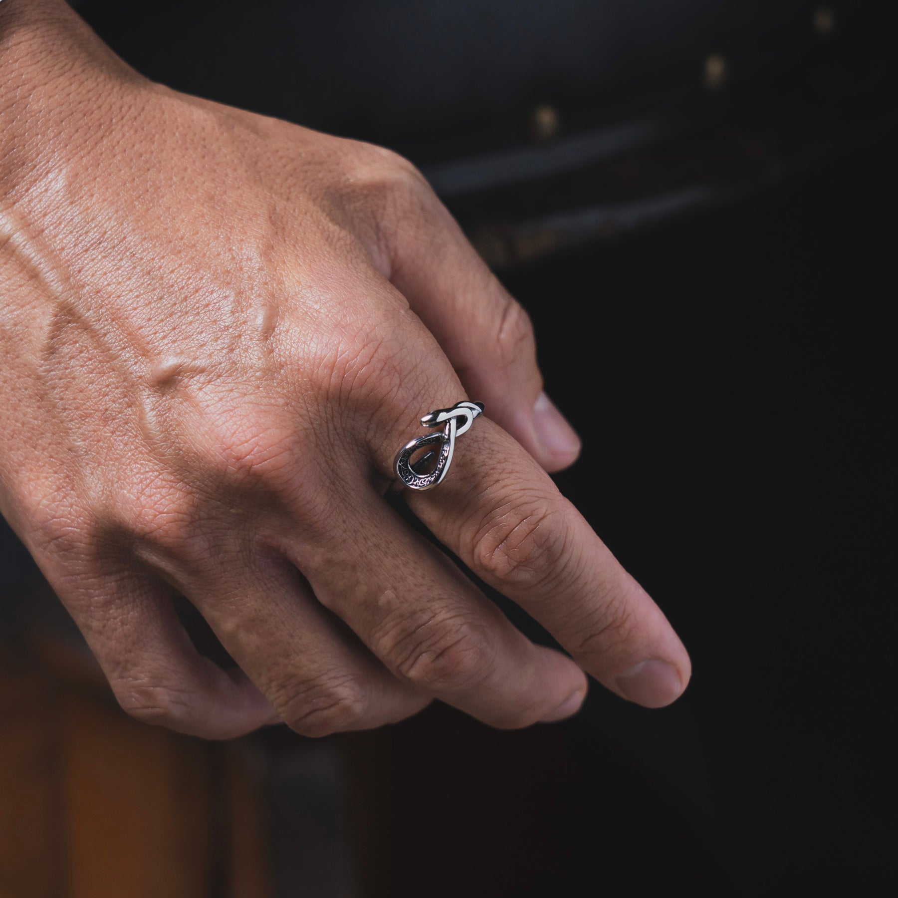 絡み合うように造形されたスネークモチーフを、クラシックな唐草模様と組み合わせたシルエットリング。