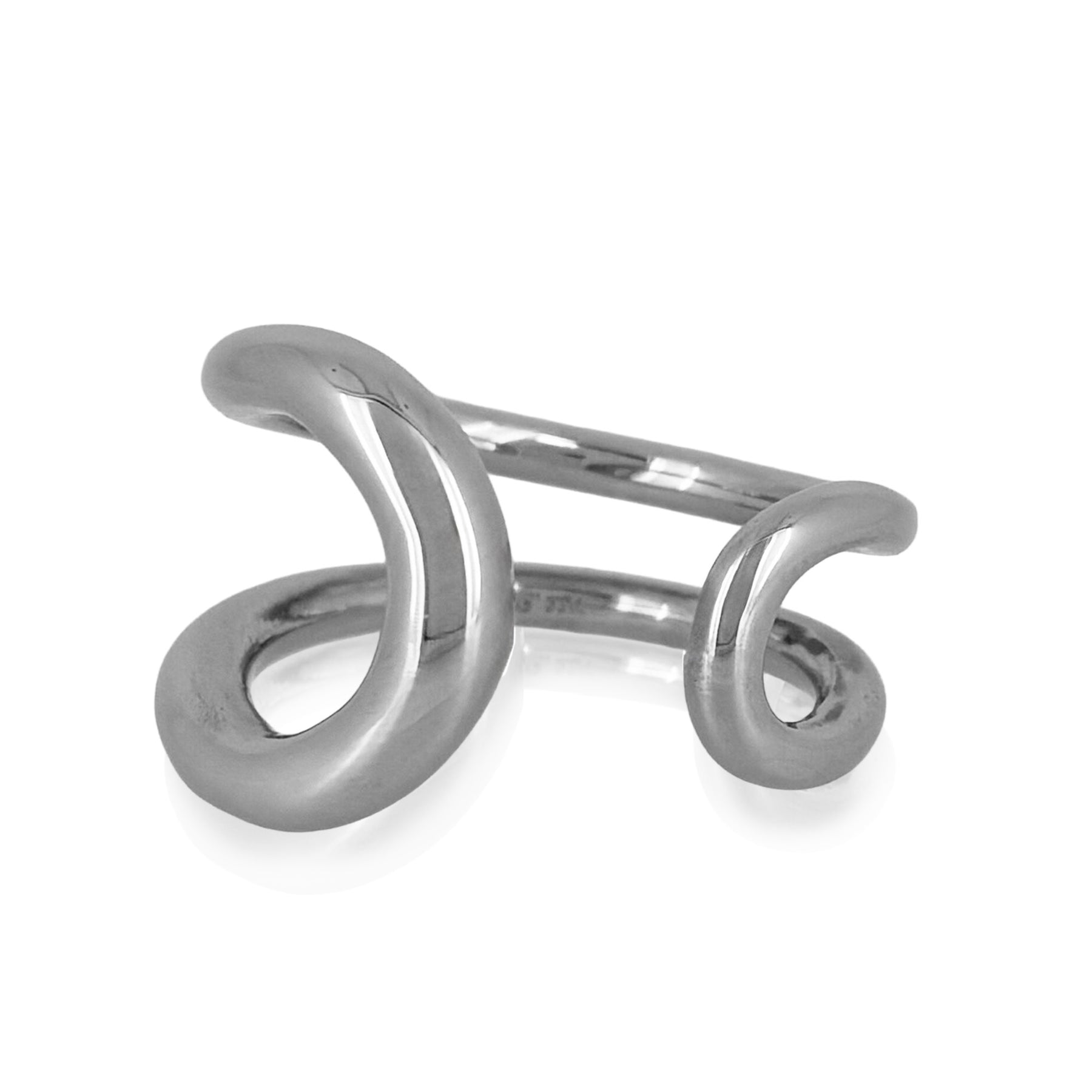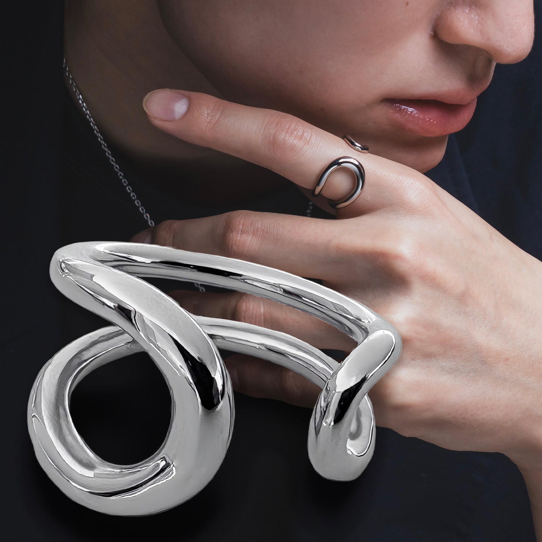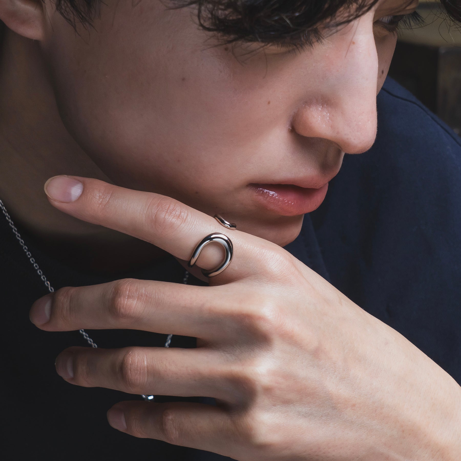 滑らかなラインが指先を包み込むように流れる、アーティスティックなシルエットのリング。