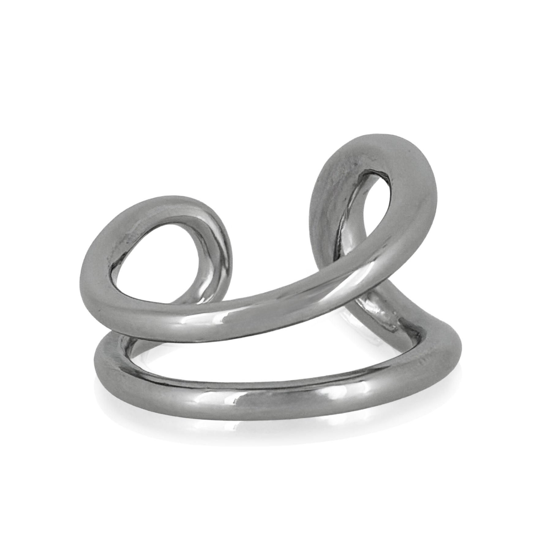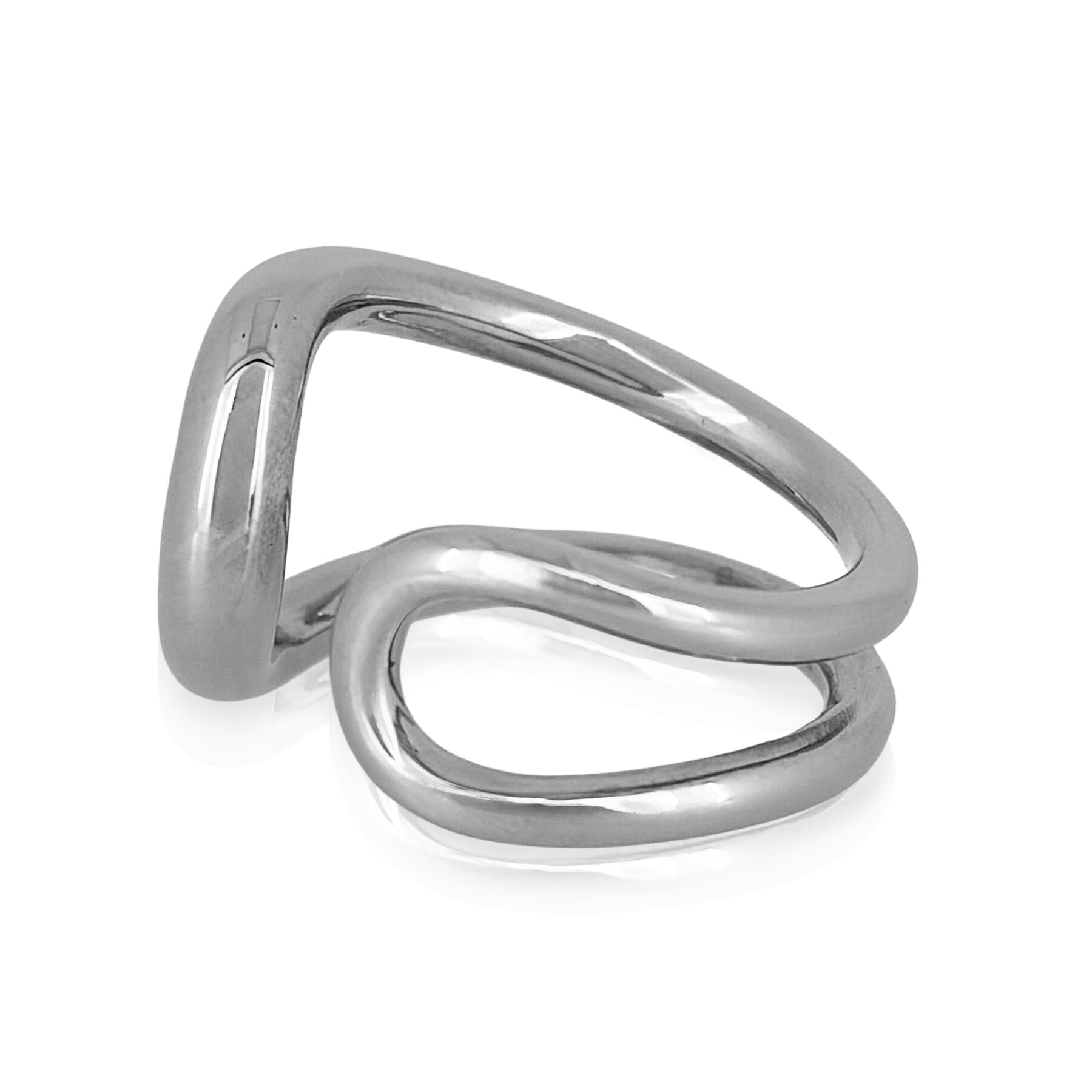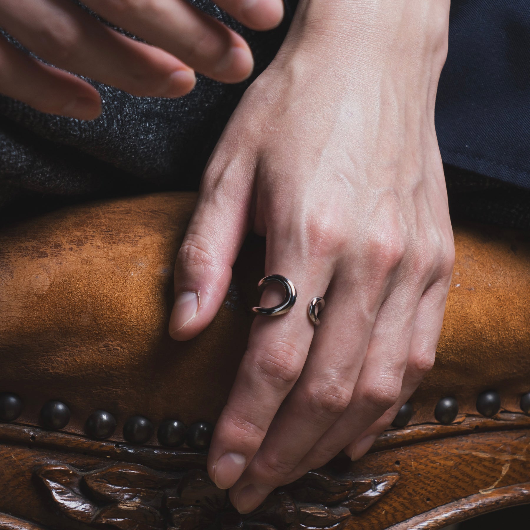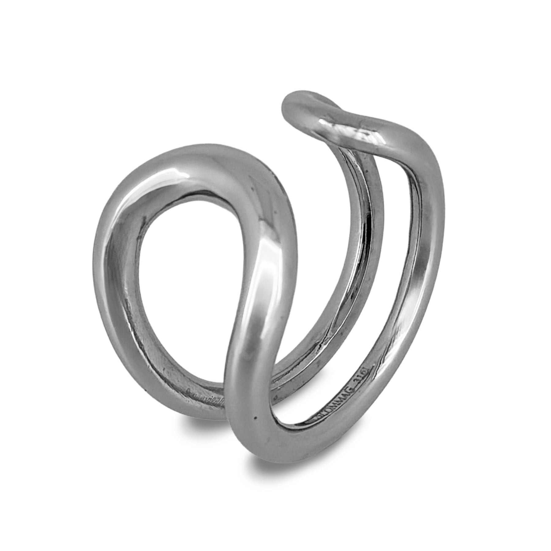 滑らかなラインが指先を包み込むように流れる、アーティスティックなシルエットのリング。