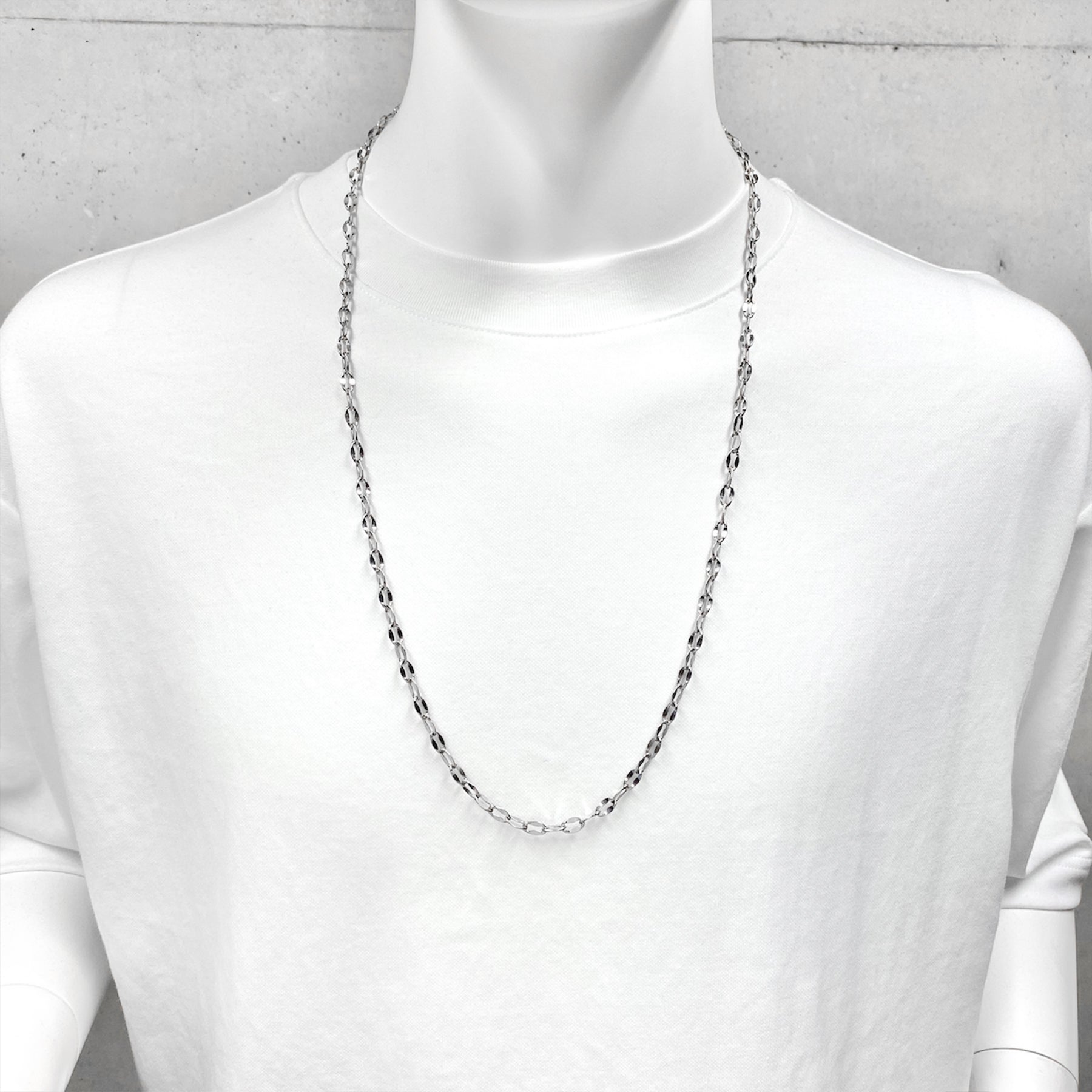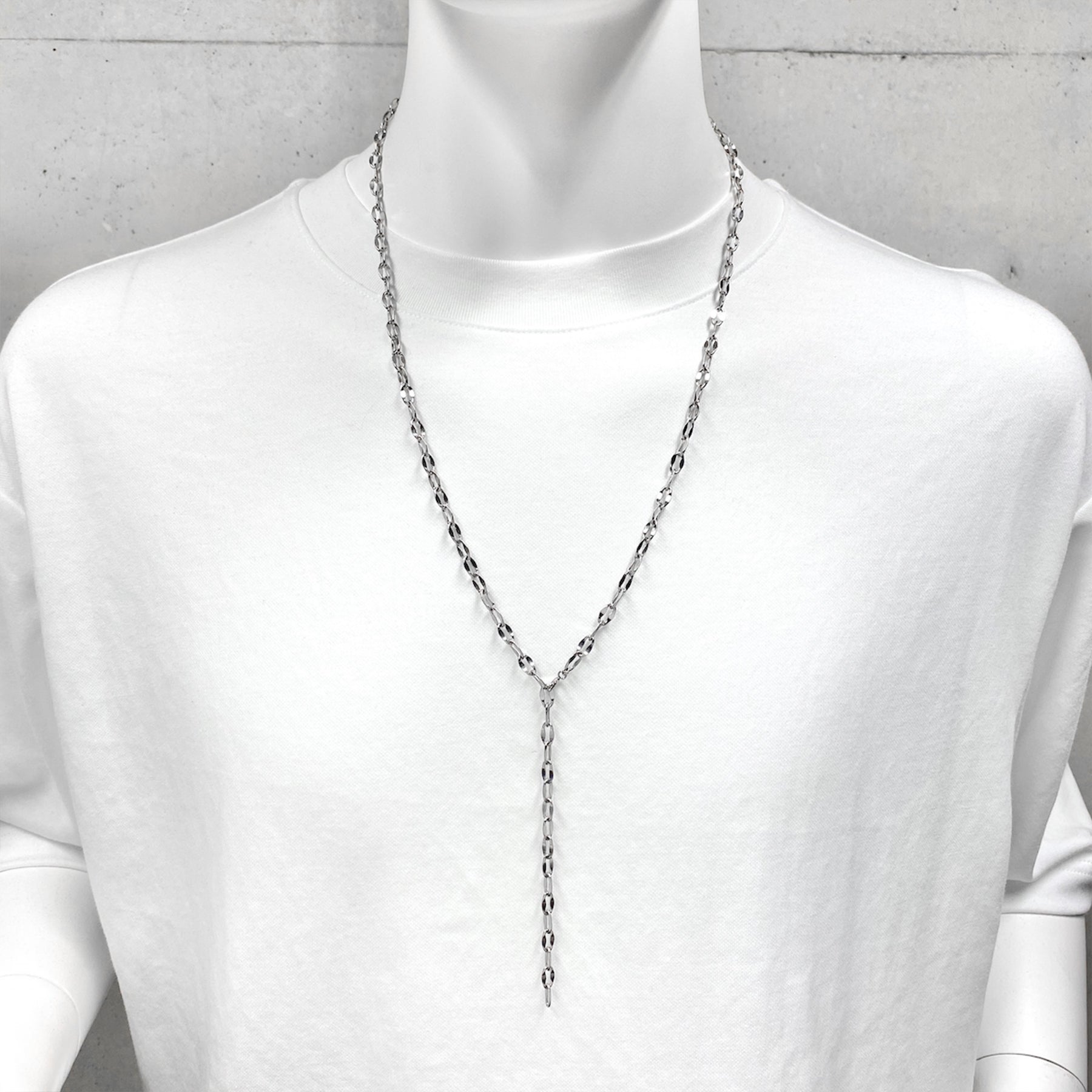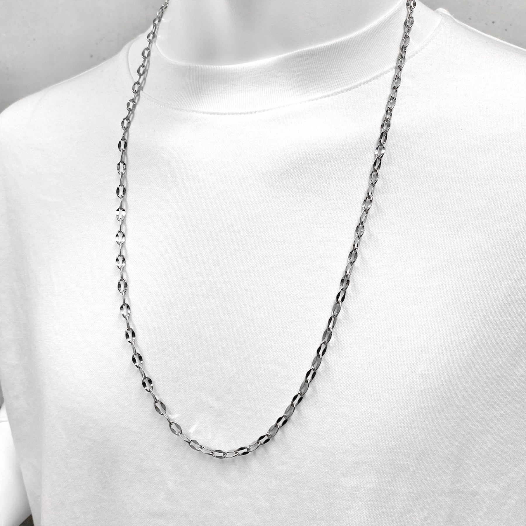 チェーンパーツを平らに圧縮したデザインで、面全体が光を反射するので煌びやかな輝きを楽しめます。オーバーサイズやビッグシルエットのスタイルとの相性抜群のロングチェーンです。【ゴールドカラーはこちら】
