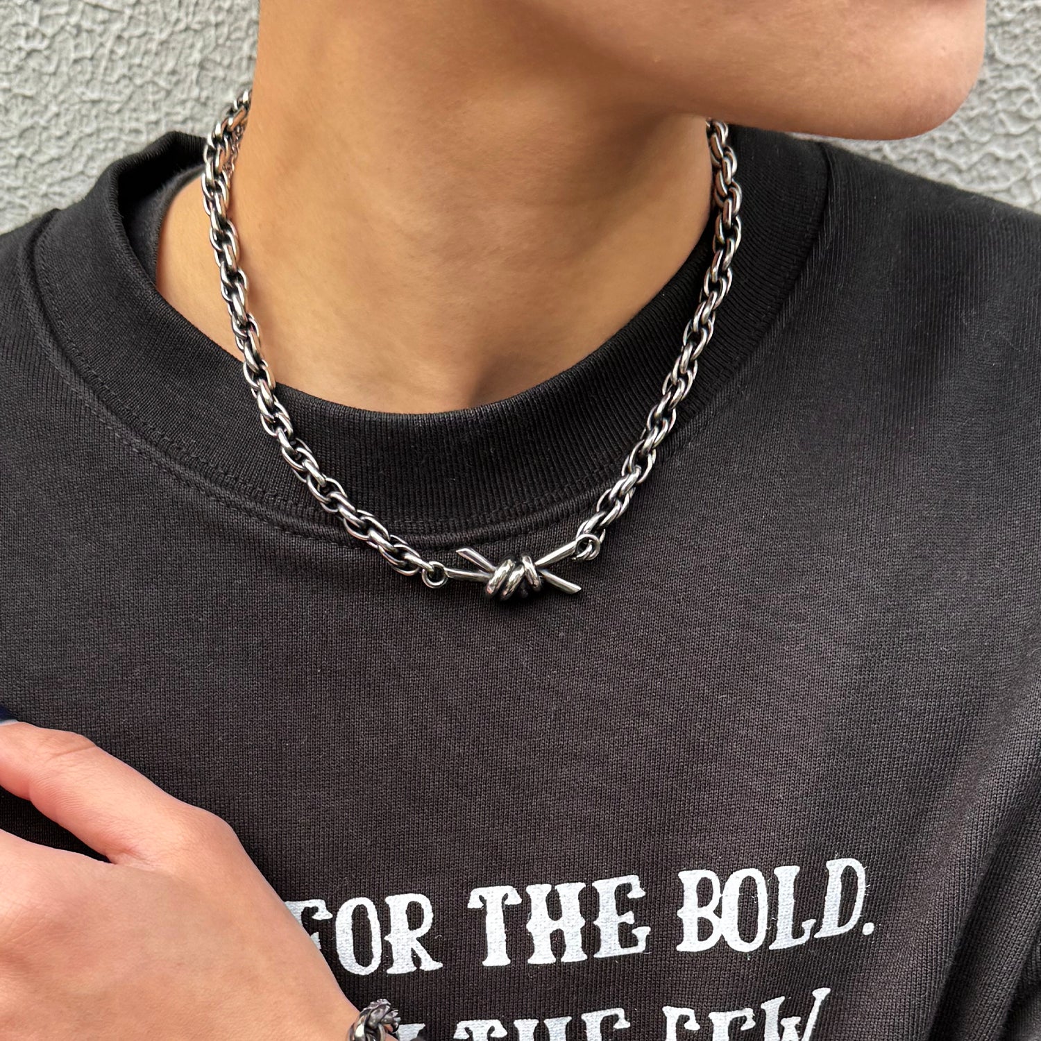 【Anri×BLESSコラボアイテム】有刺鉄線の“鋭さ”と、結び目の“締める美学”無骨なチェーンに、刃のような緊張感を宿したノット(結び)のディテール。反骨的なのにクリーン、攻めているのに上品。スタイルに一本筋の通ったエッジが生まれ、シンプルな装いほど強く映えます。●Anri洗練されたボーイッシュスタイルで注目を集めるファッションモデル。カジュアルからモードまで自在に着こなし、等身大の魅力を発信中。InstagramやTikTokで多くのファンを魅了する次世代インフルエンサー。Instagram https://www.instagram.com/anchan_0731/Tik Tok https://www.tiktok.com/@anchan_0731