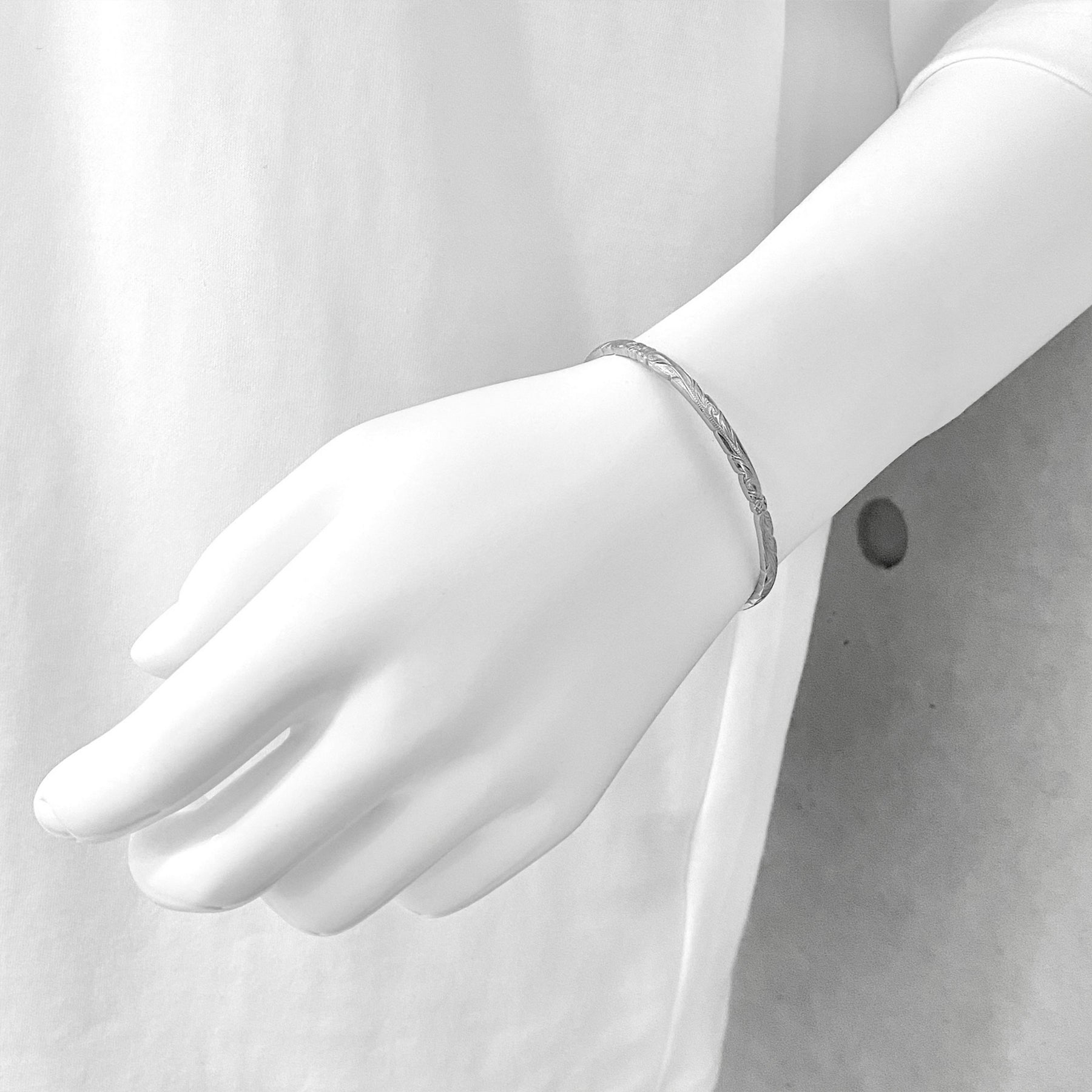 幸せを運び災いから身を守ってくれると伝えられているホヌ(ウミガメ)と、永遠の愛を意味するスクロール(波)の模様を施したハワイアンジュエリーバングル。