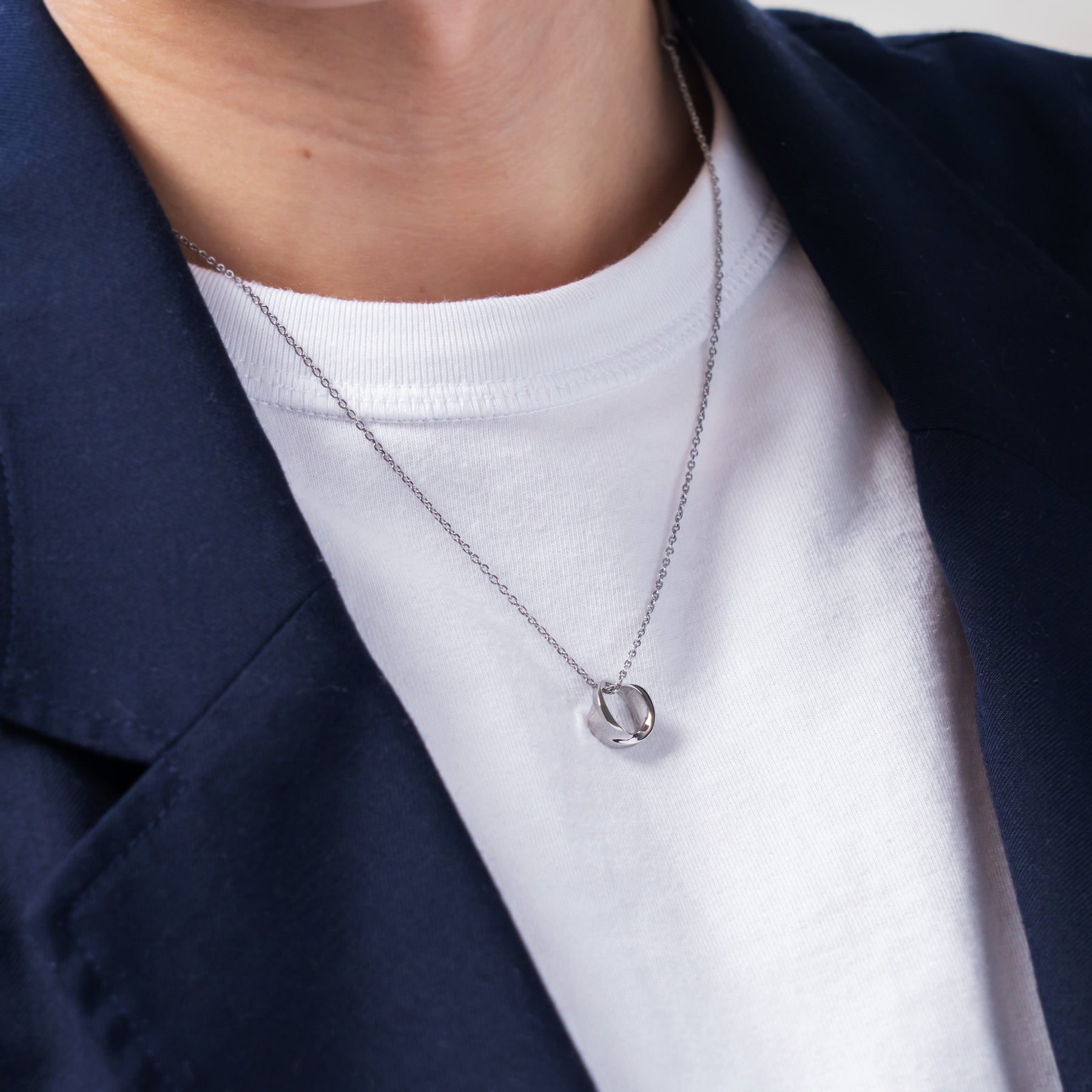 正面を向く立体的なリングはコンパクトながらもしっかりと存在感があり、胸元にほど良いアクセントをもたらしてくれます。