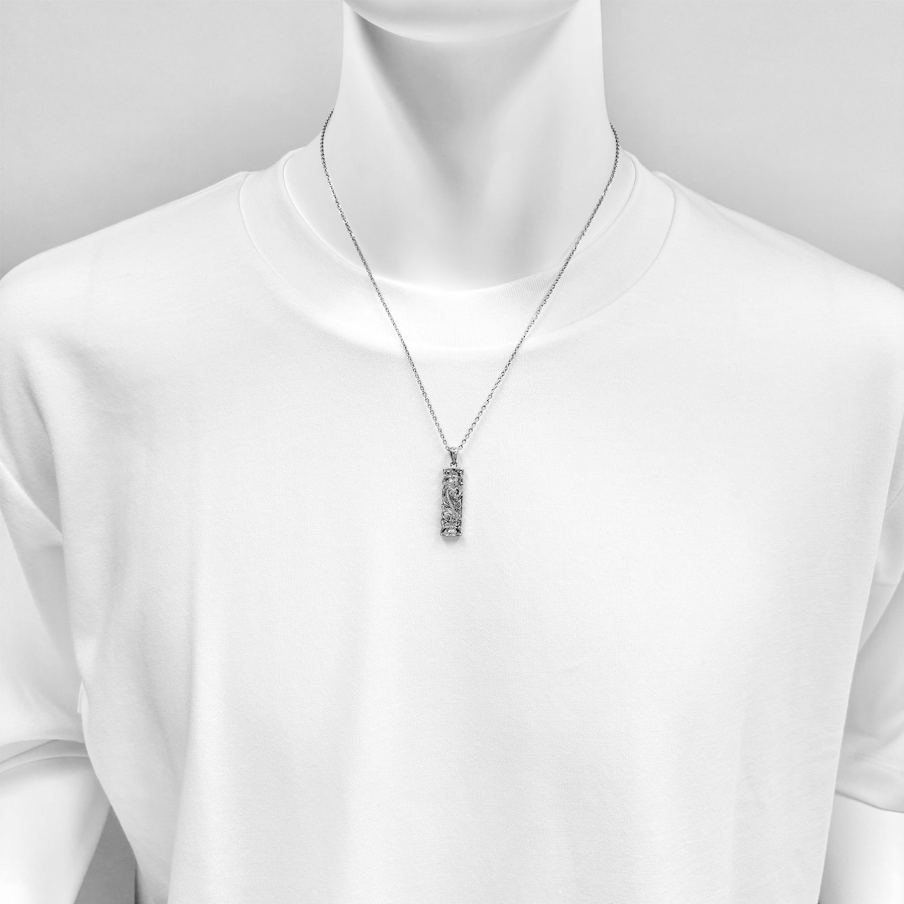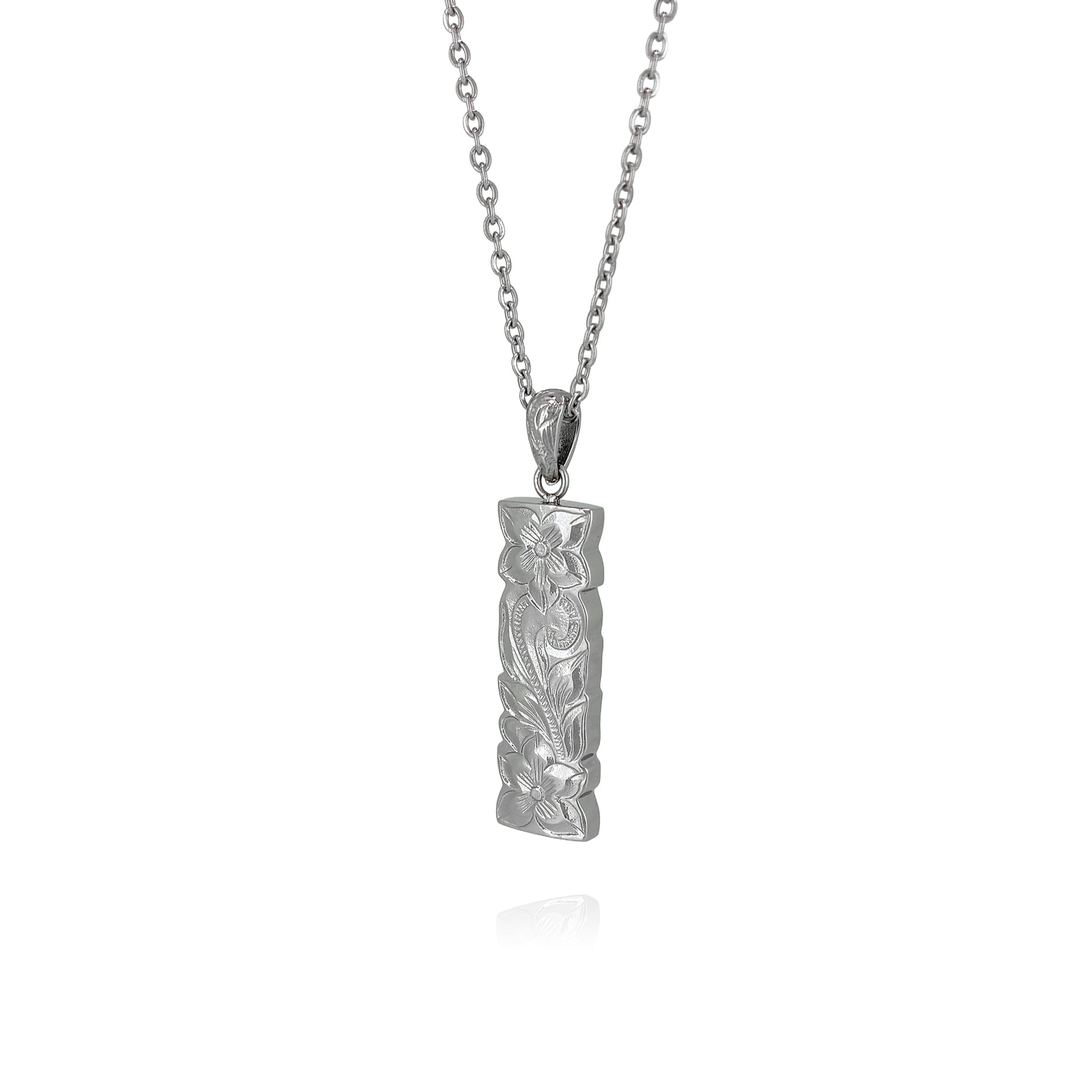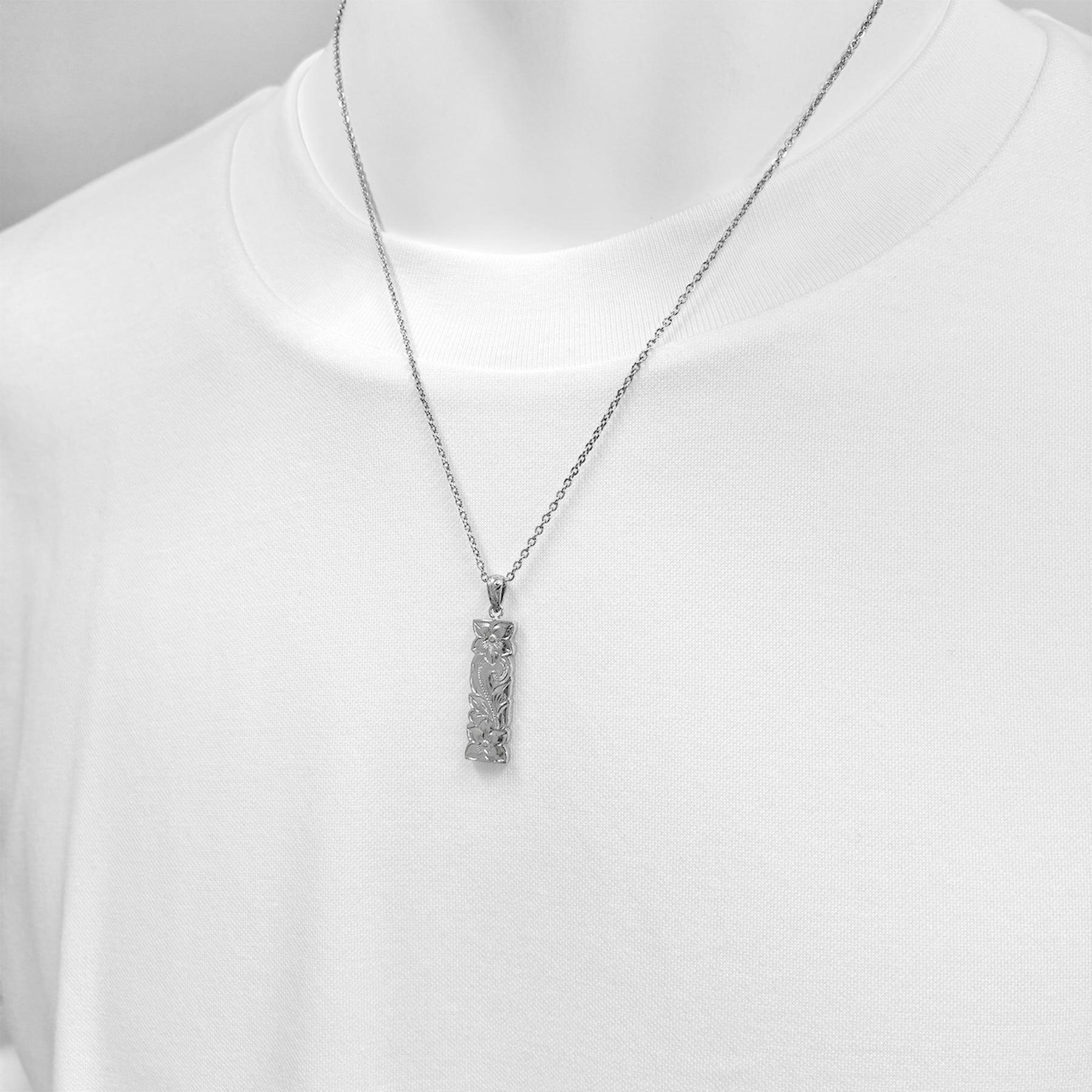 ハワイアンジュエリーを象徴する、プルメリアとスクロール(波)模様を縦長プレートに刻んだネックレス。