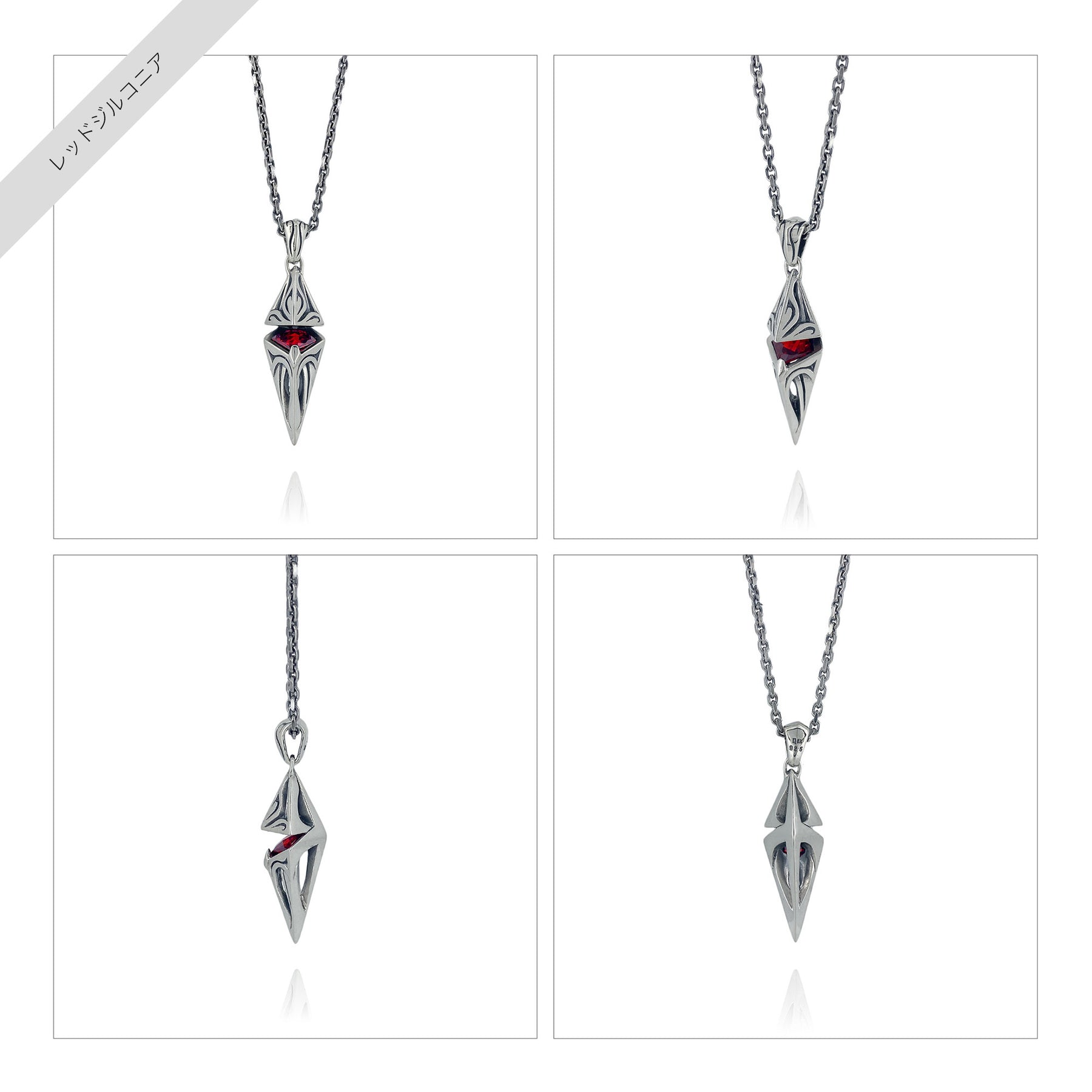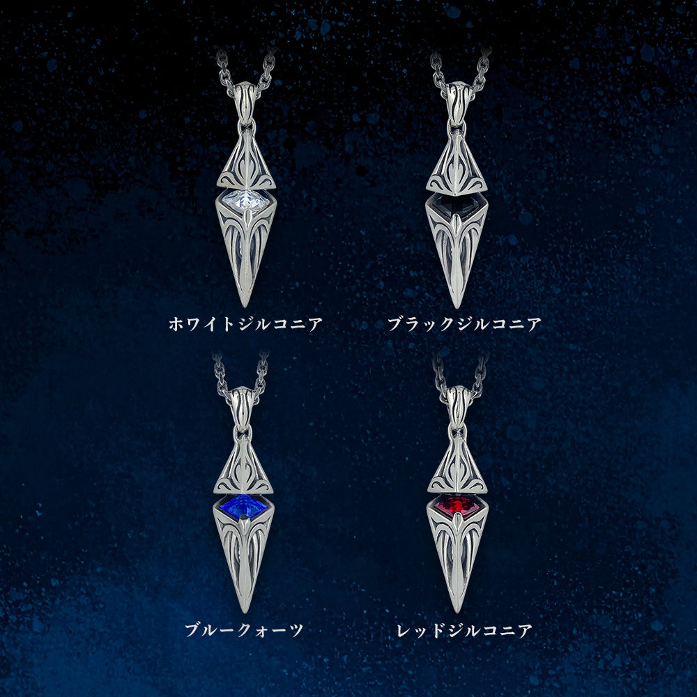 立体的に組まれたメタルラインは、どこから見ても隙のない造形美。胸元に落ちる影までも計算された、モードな佇まいです。センターに配したストーンは ブルー/ホワイト/ブラック/レッド の4色から選択可能。