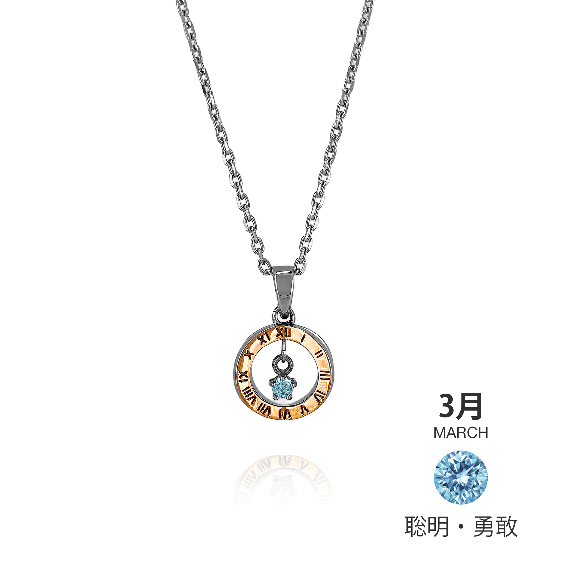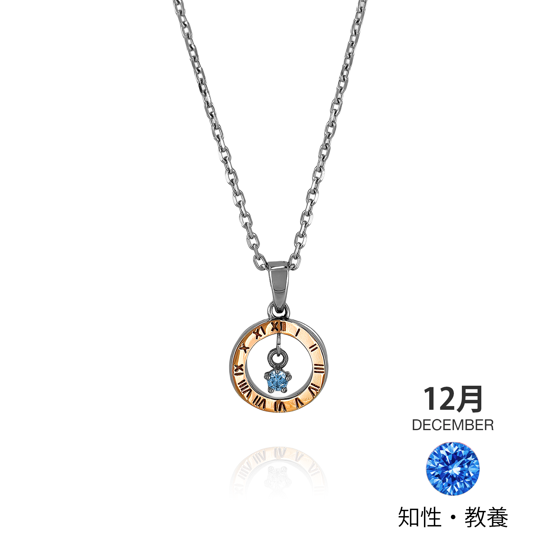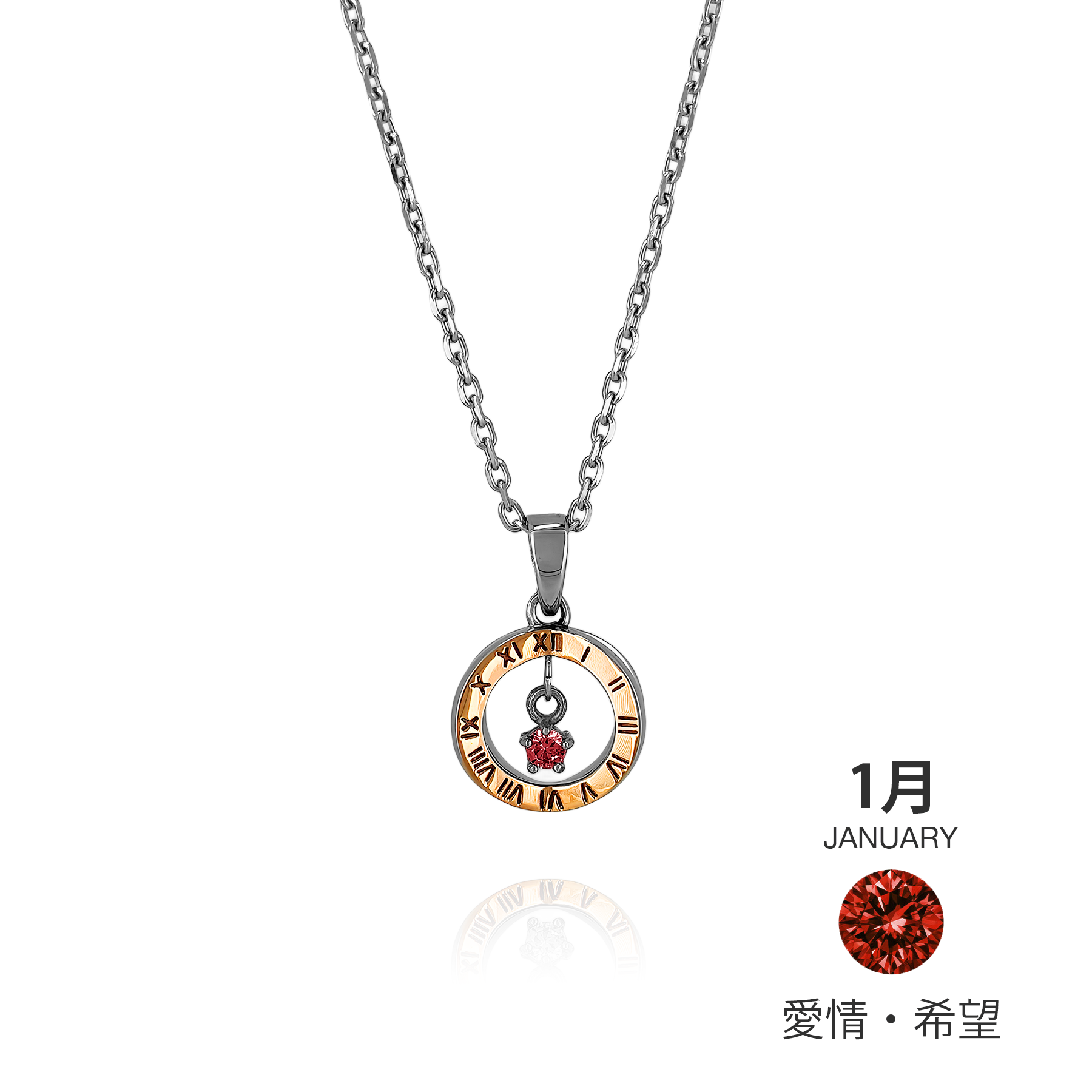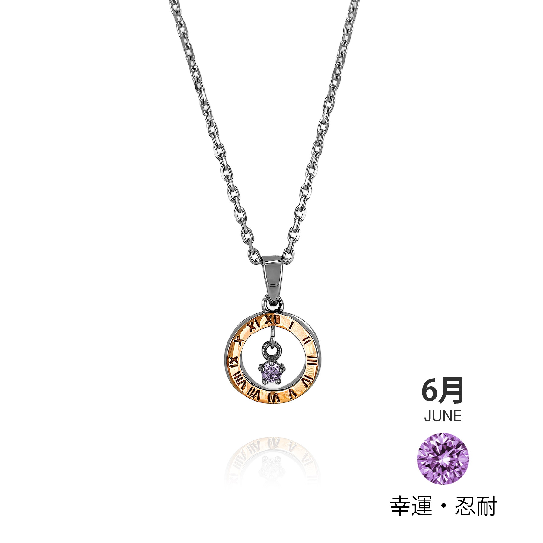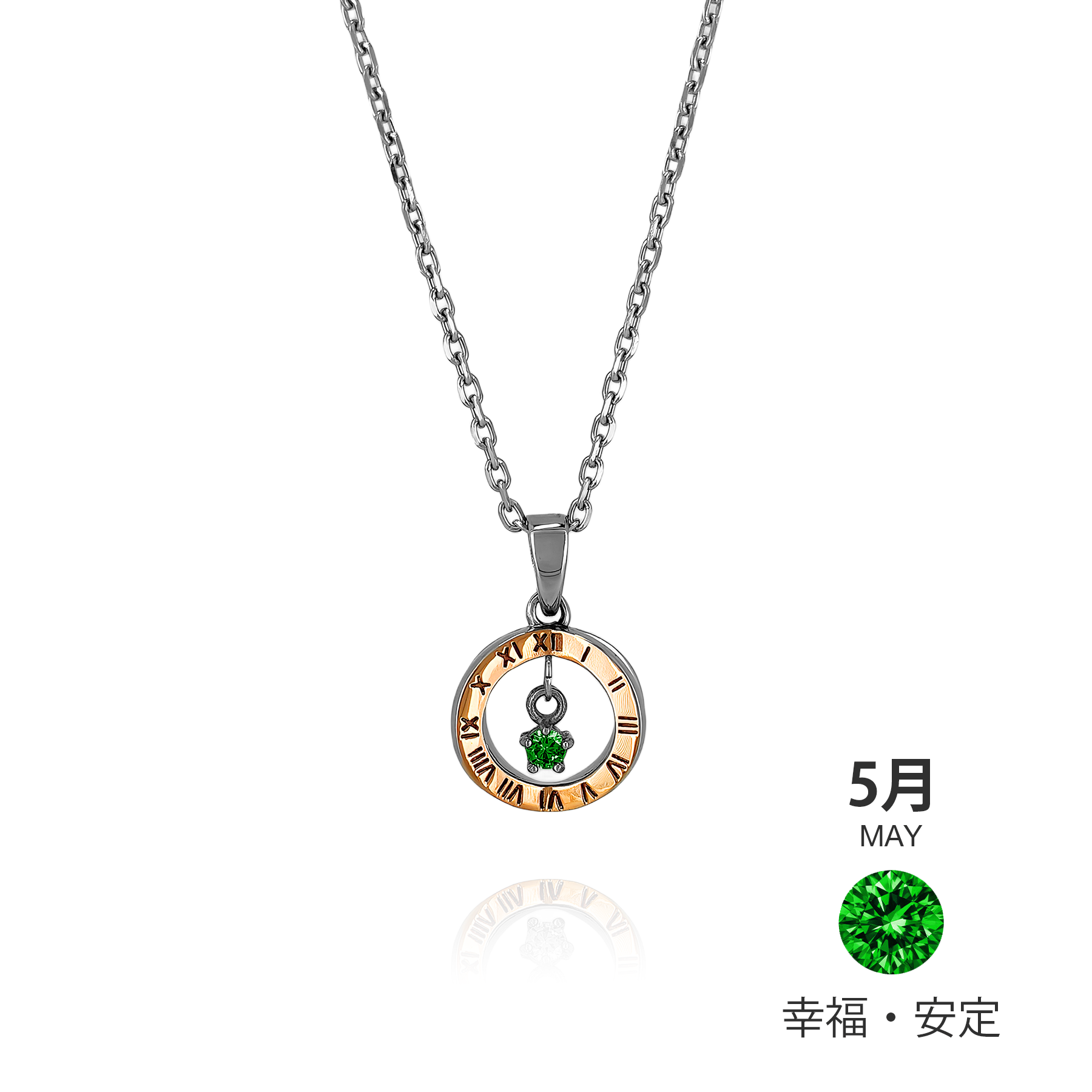 時間を刻むローマン数字と、胸元で揺れる誕生石。