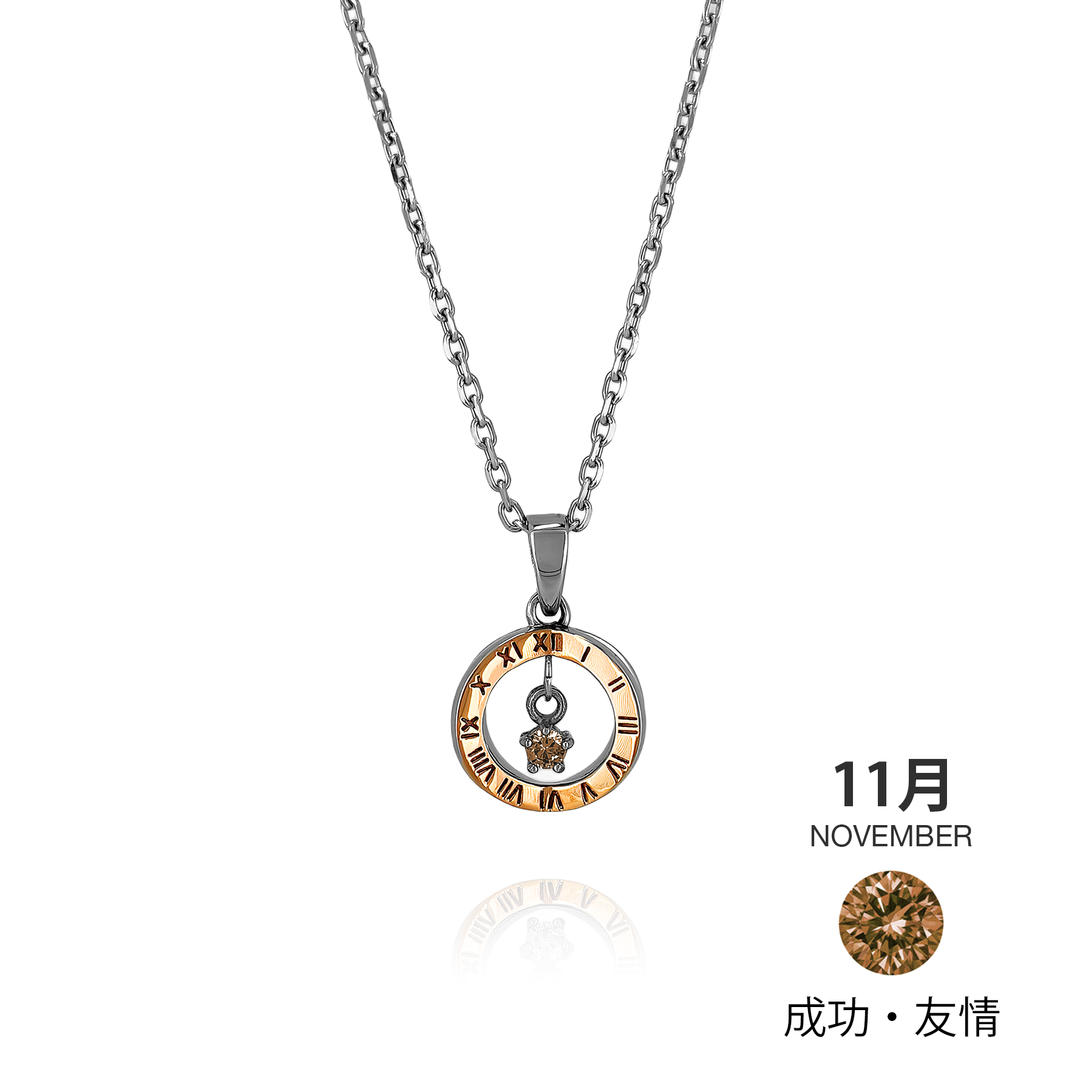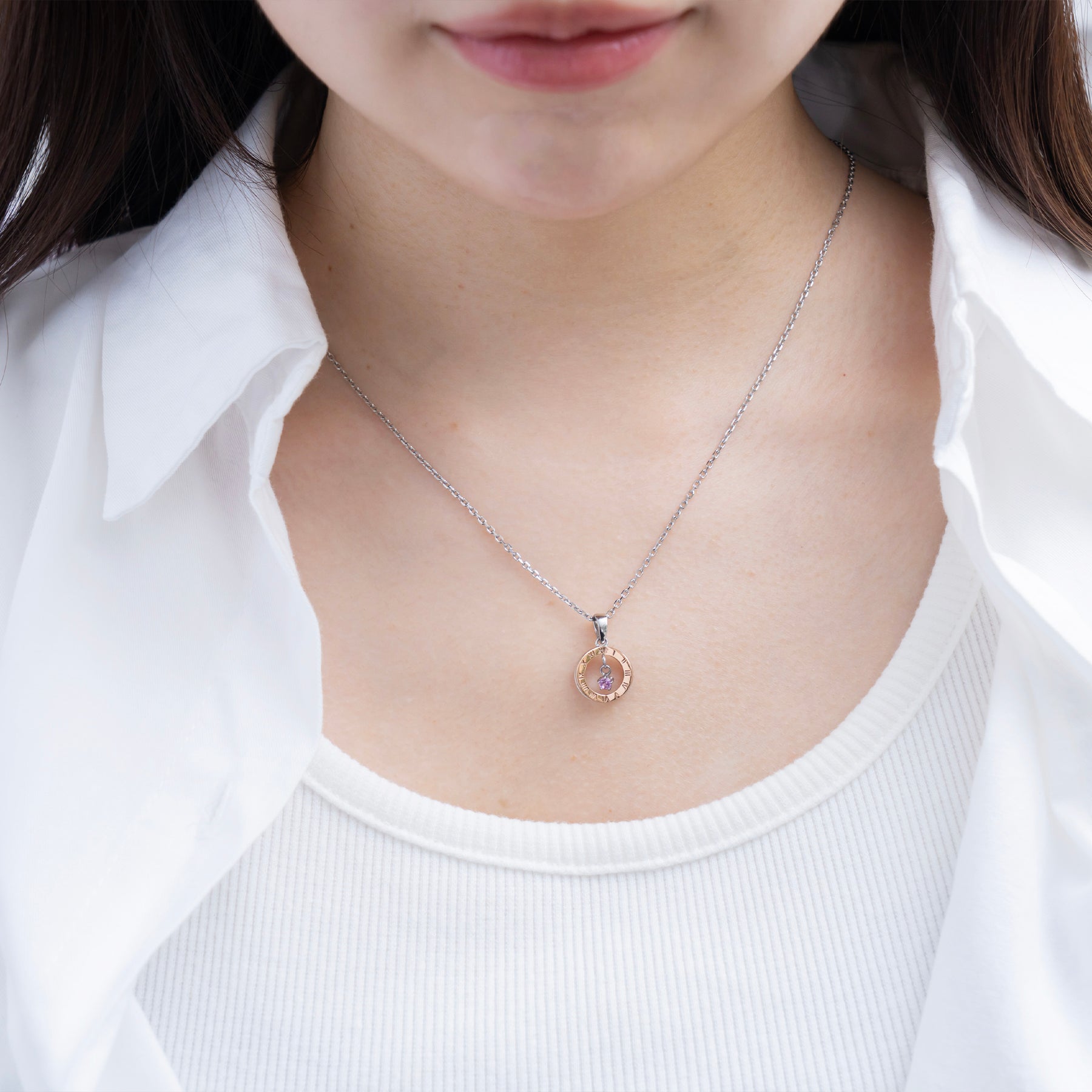 ペンダント中央には、12色から選べるバースストーンをセット。動くたびにきらりと揺れるストーンが、上品な存在感を演出します。カラーは艶やかなピンクゴールド × シルバーのコンビ仕上げ。