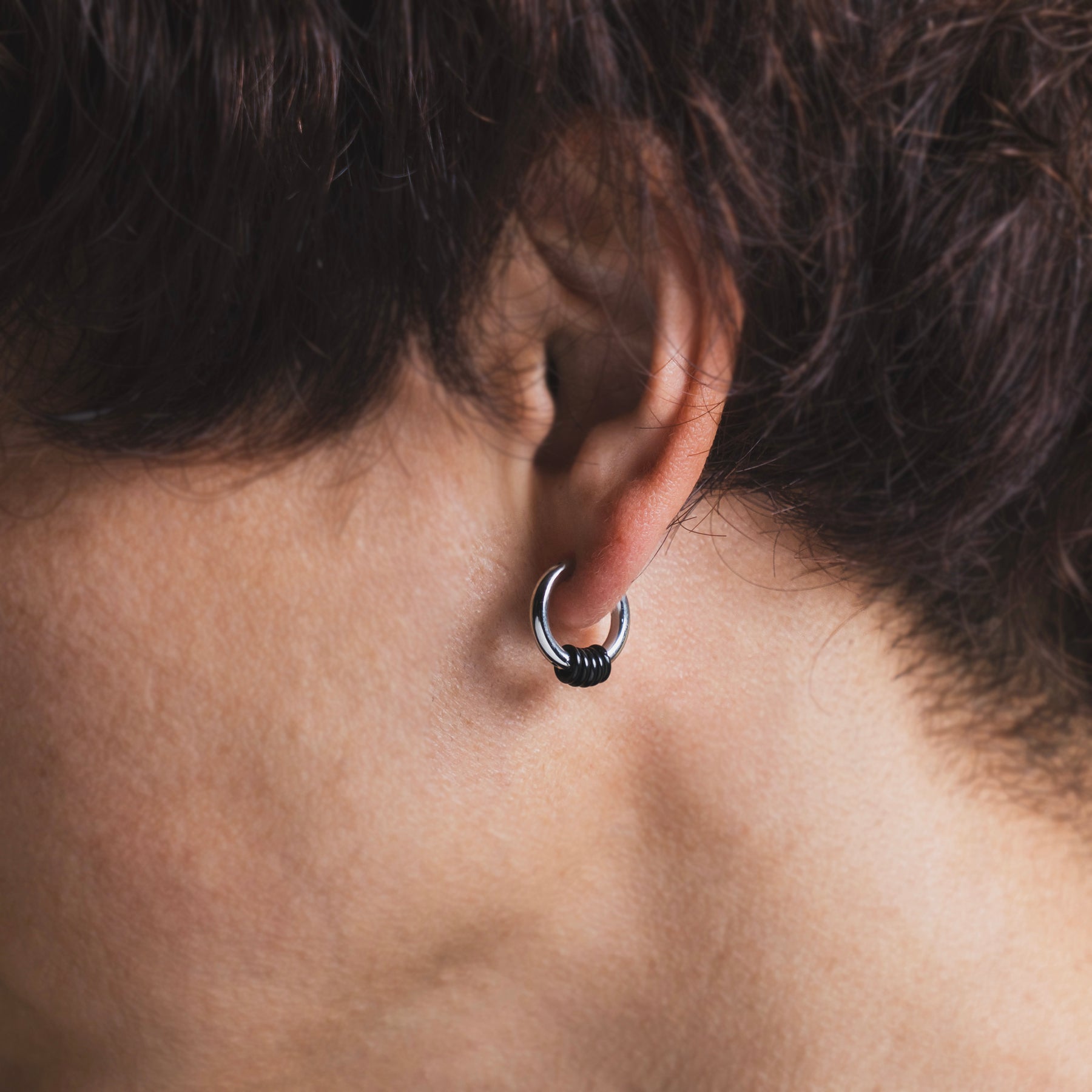 クールなシルバーフープに、ブラックリングを重ねたデザインピアス。
