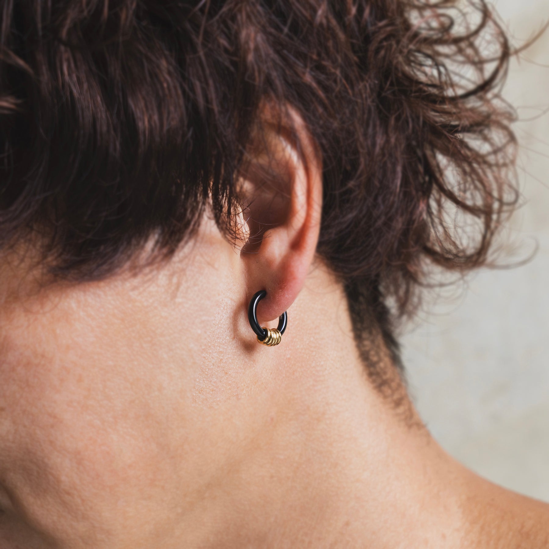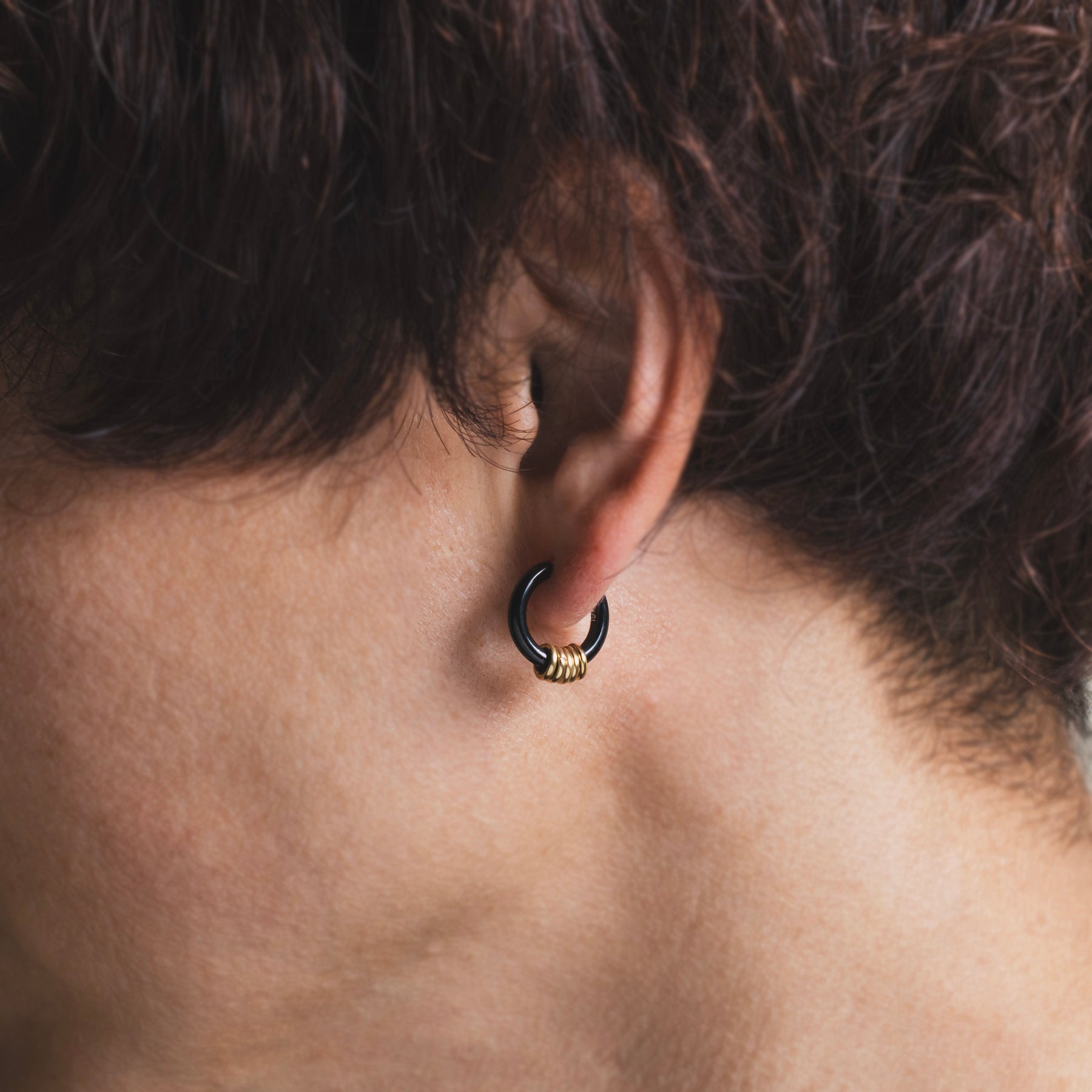 クールなブラックフープに、ゴールドリングを重ねたデザインピアス。