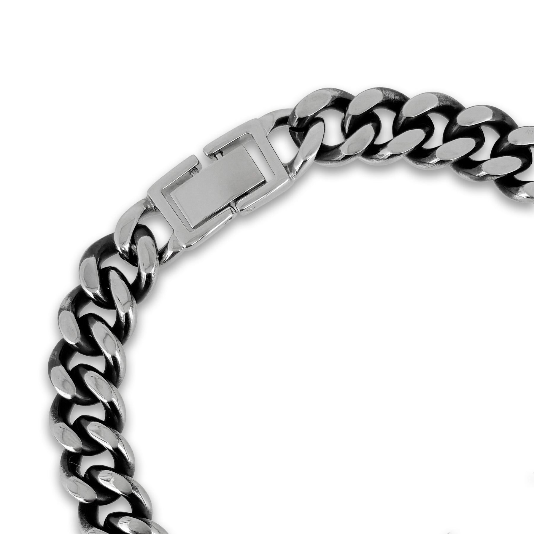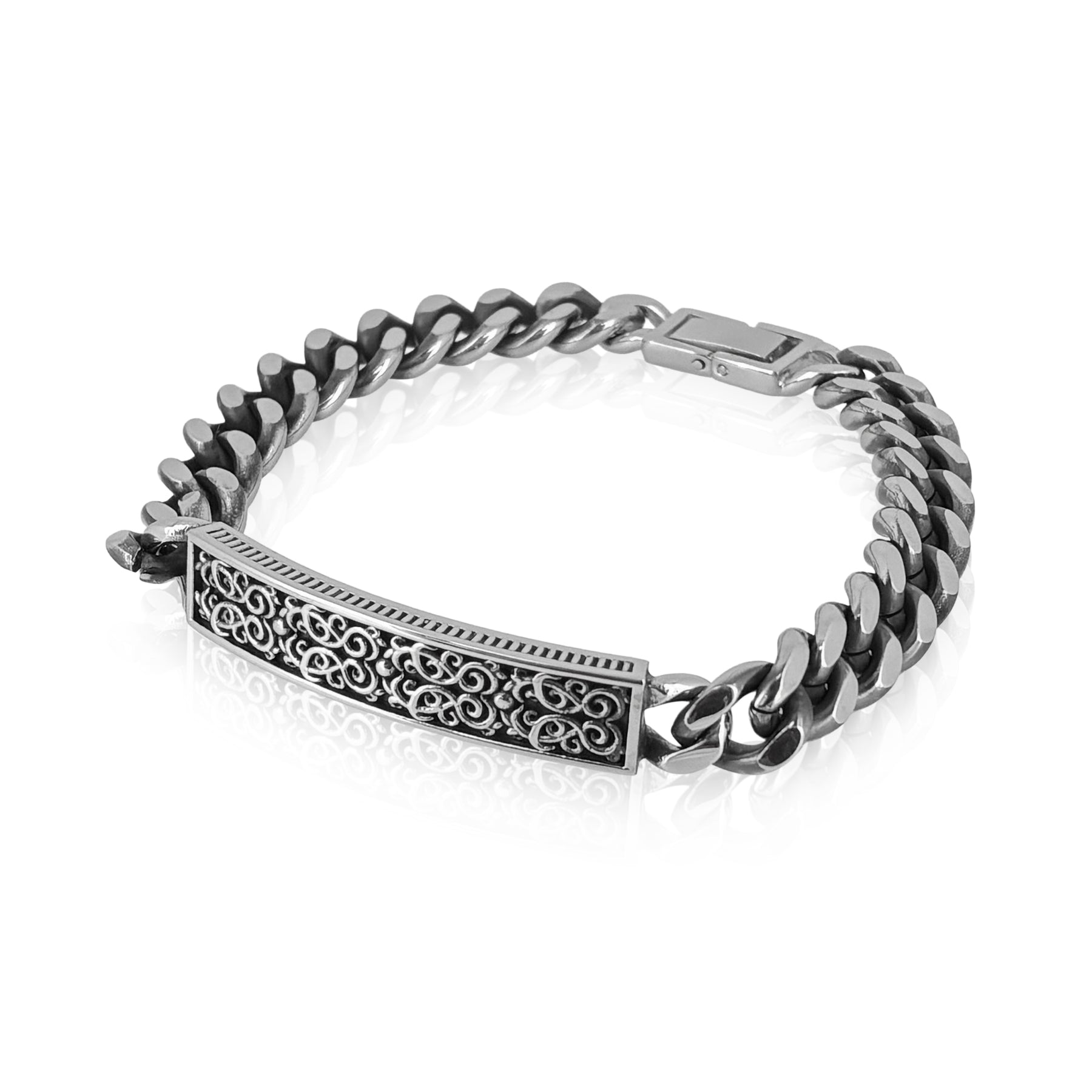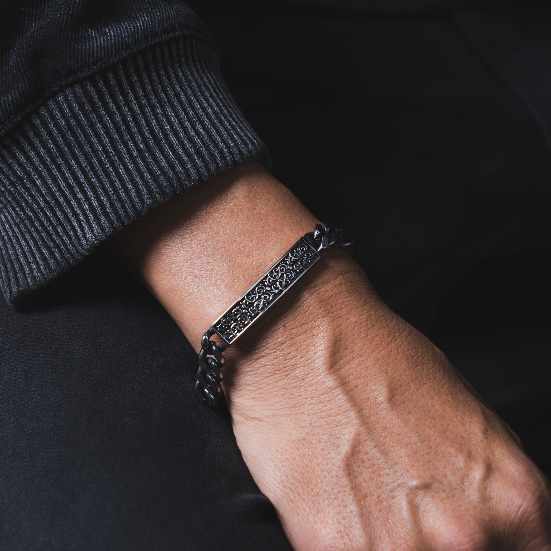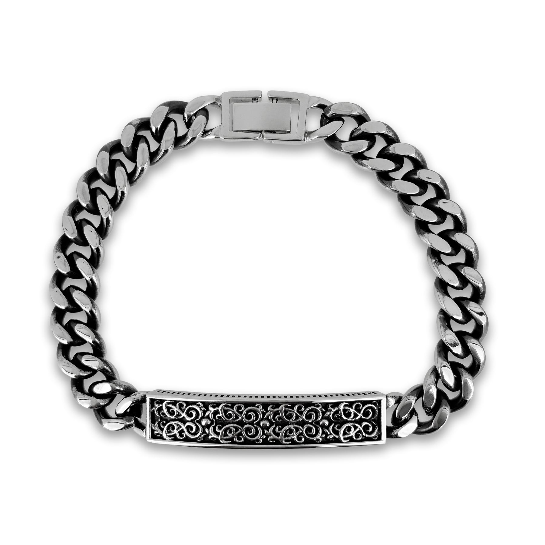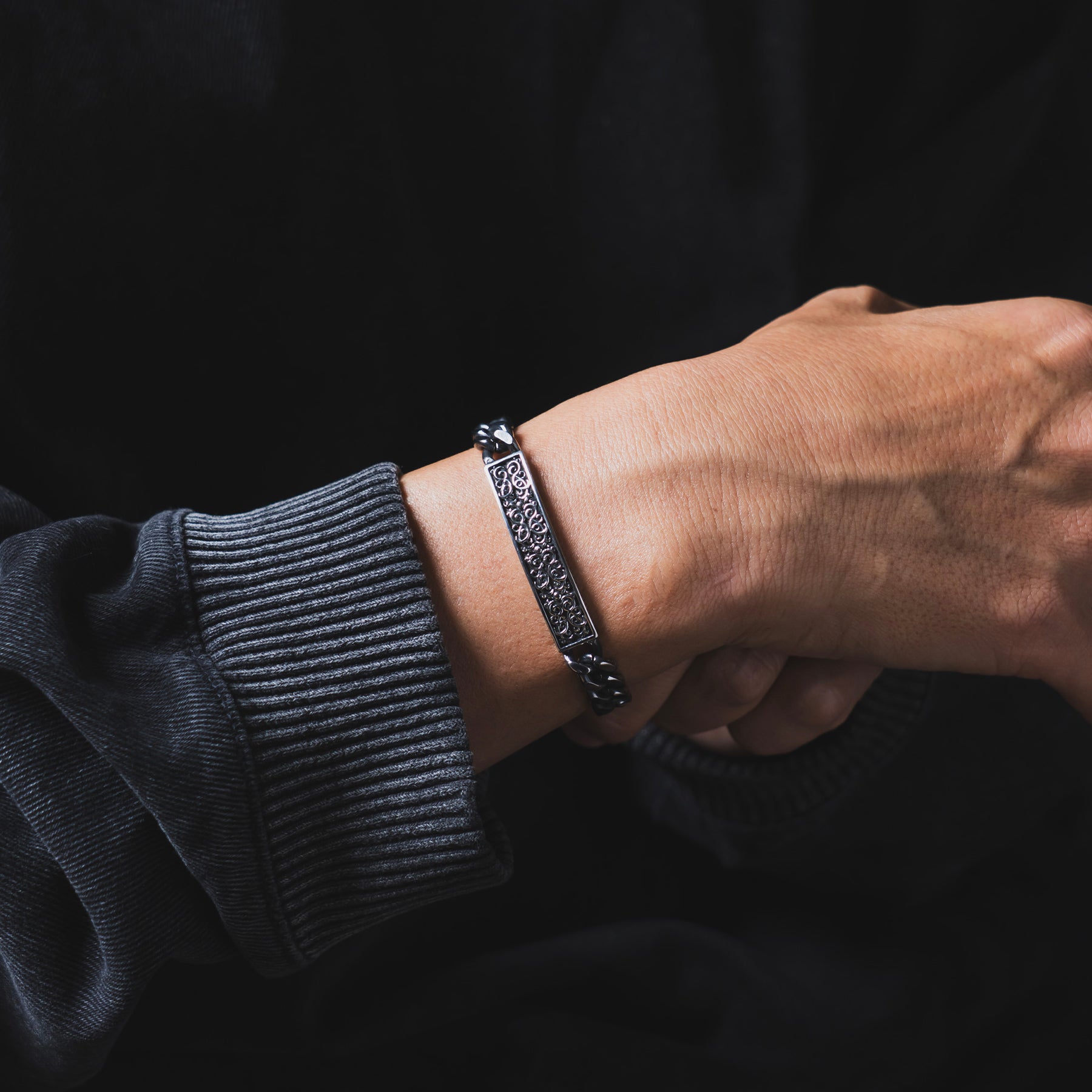 重厚感あるキヘイチェーンに、ヴィンテージ調の唐草模様をあしらったバーを組み合わせたブレスレット。
