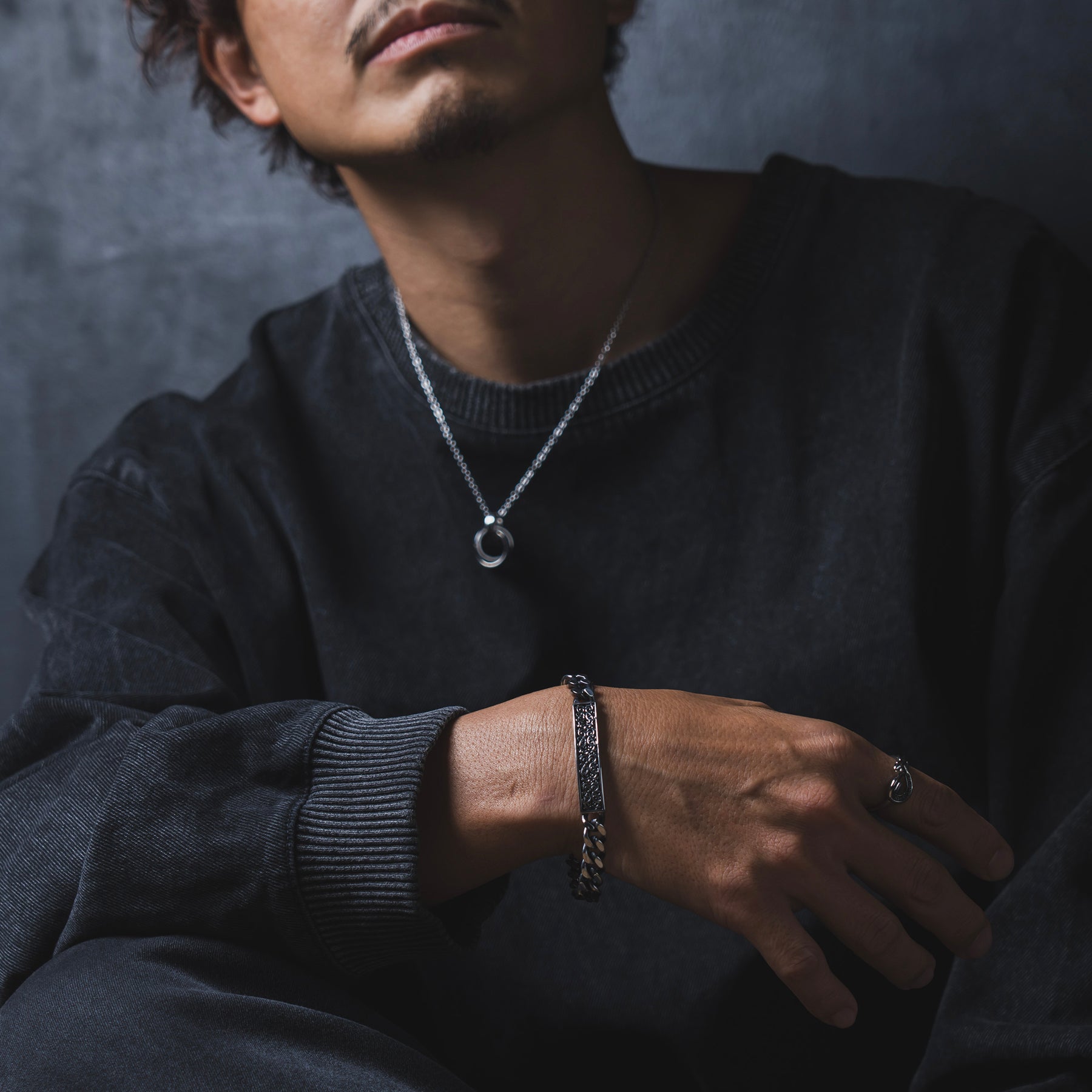 無骨さと、唐草模様のクラシカルな表情が絶妙に調和し、カジュアルからモードまで幅広いスタイルにフィット。