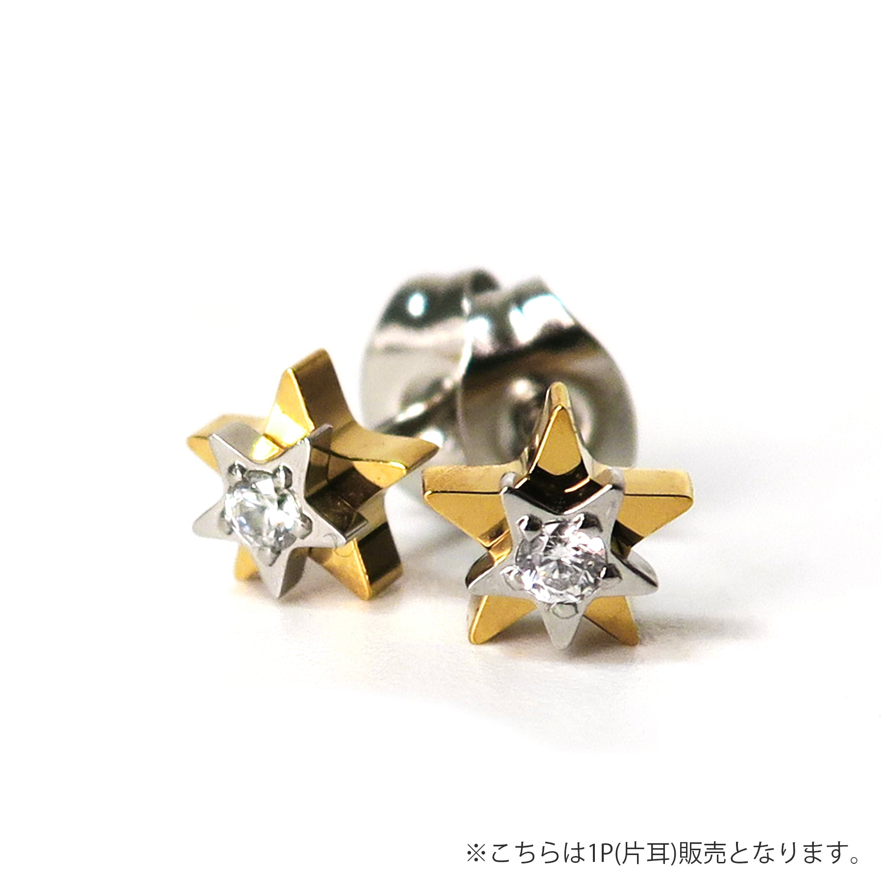 ゴールドとシルバーが重なり合う立体的なスターに、きらめくストーンをセッティング。