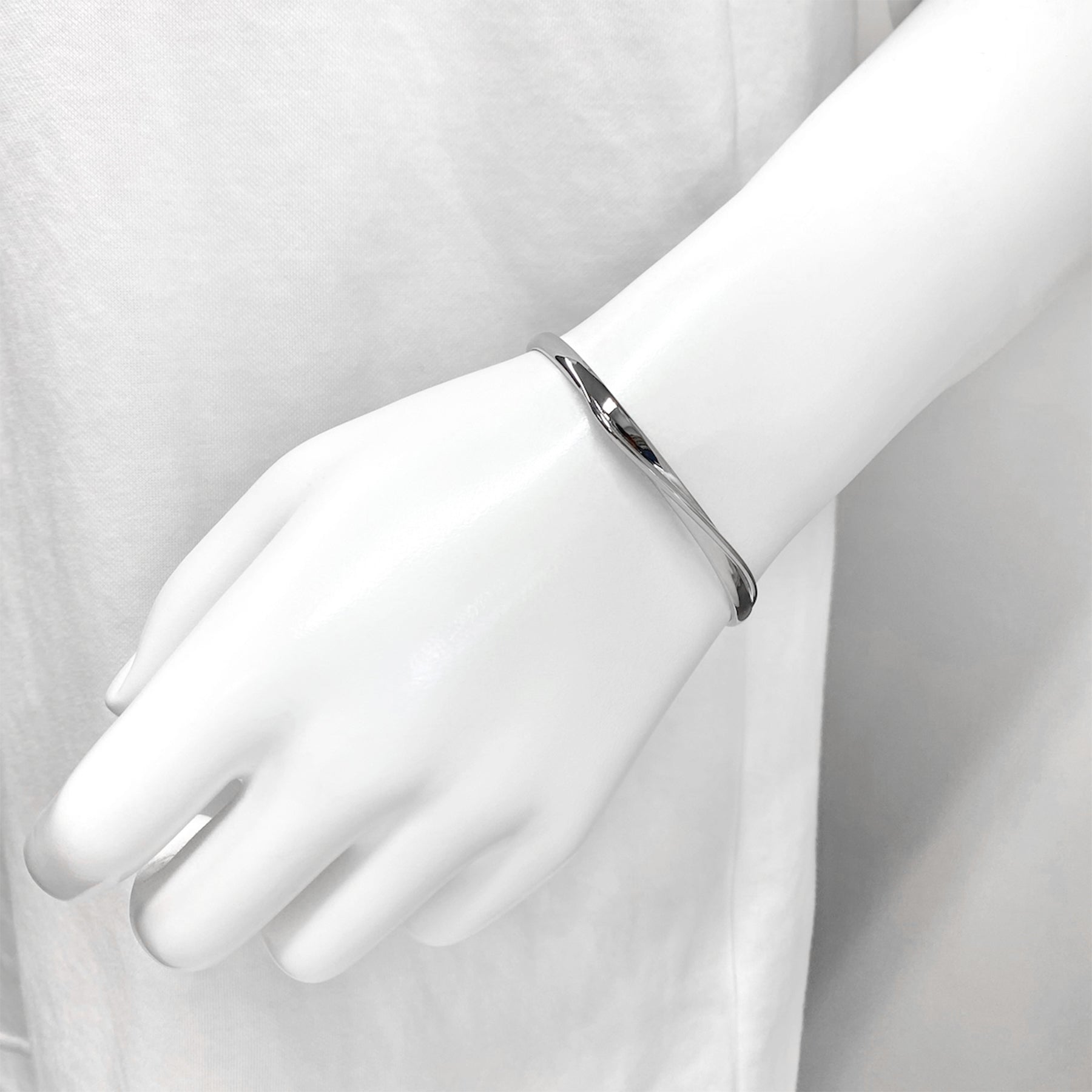 手首の中心部分にあたる箇所に柔らかなハーフツイストを施し、手首周りをスッキリかつ上品に魅せてくれるデザイン。ツイストが生み出す造形は、光の反射と影を美しく表現し高級感ある仕上がりに。デイリーで使えるスマートなフォルムが魅力的。