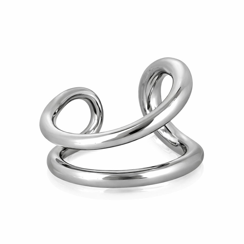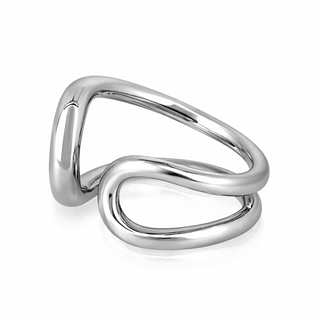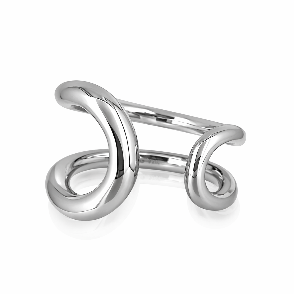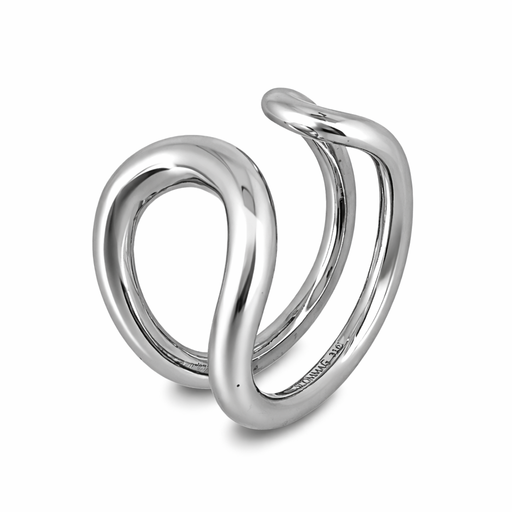 滑らかなラインが指先を包み込むように流れる、アーティスティックなシルエットのリング。
