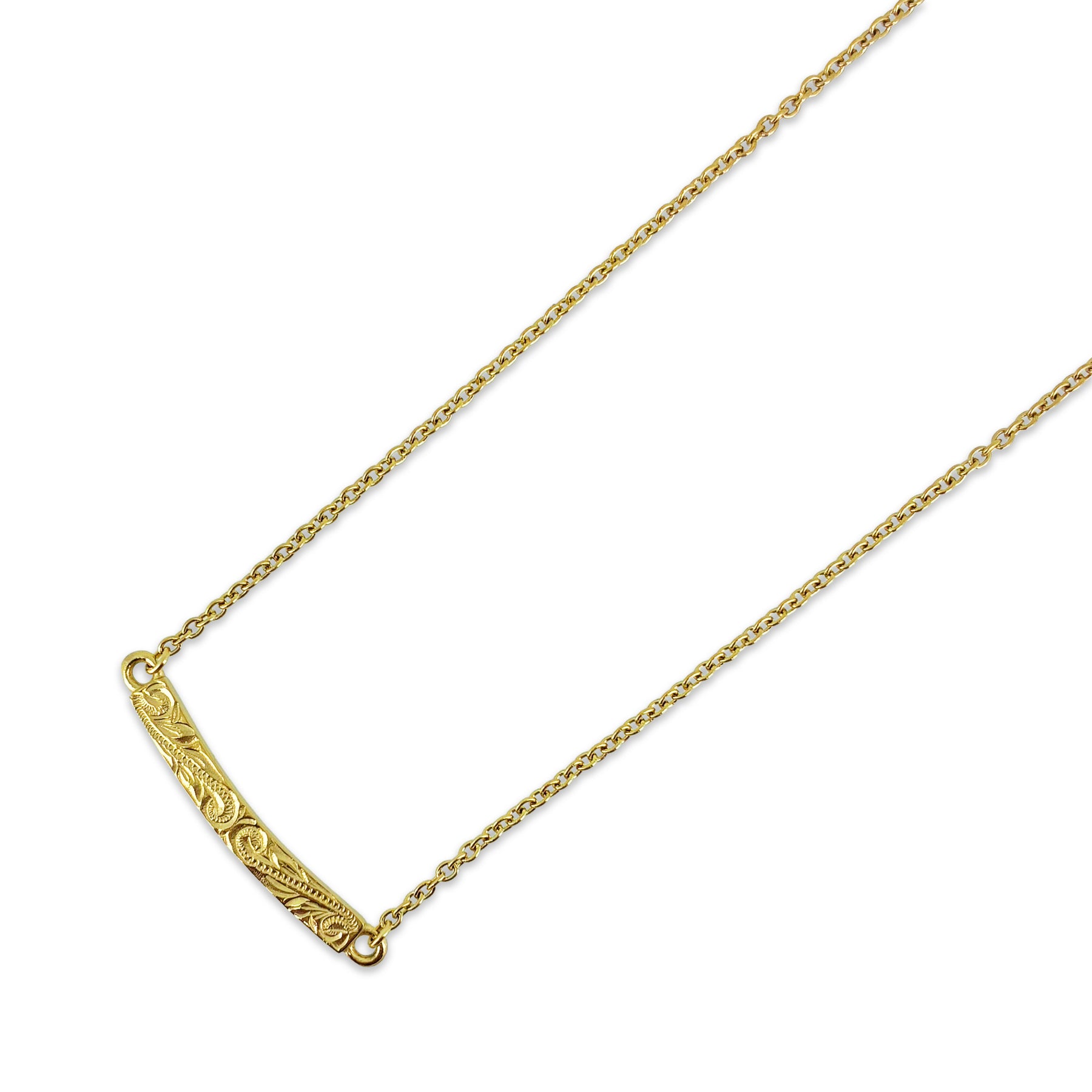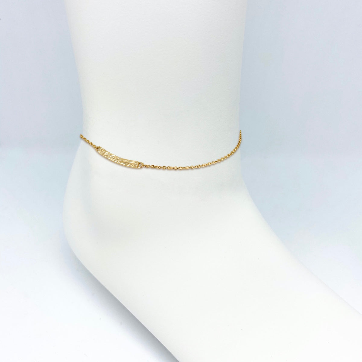 繊細なチェーンに、彫り柄を施したカーブバーを添えたミニマルなアンクレット。
