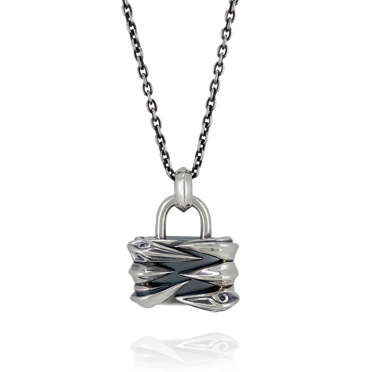 大切なものを守り、運命を切り拓く意味を持つ南京錠モチーフにM'S COLLECTIONの人気デザイン「テンタクルス」を組み合わせた重厚なネックレス。エッジの効いたシャープな仕上げと燻しのコントラストが美しい造形美に酔いしれる逸品です。