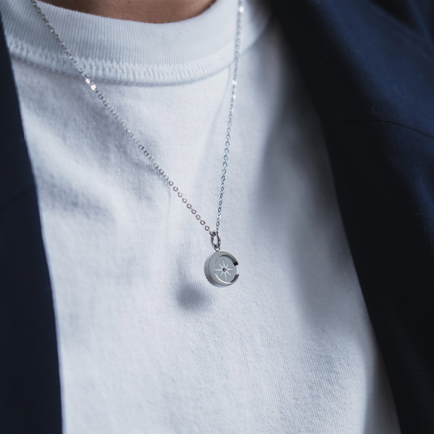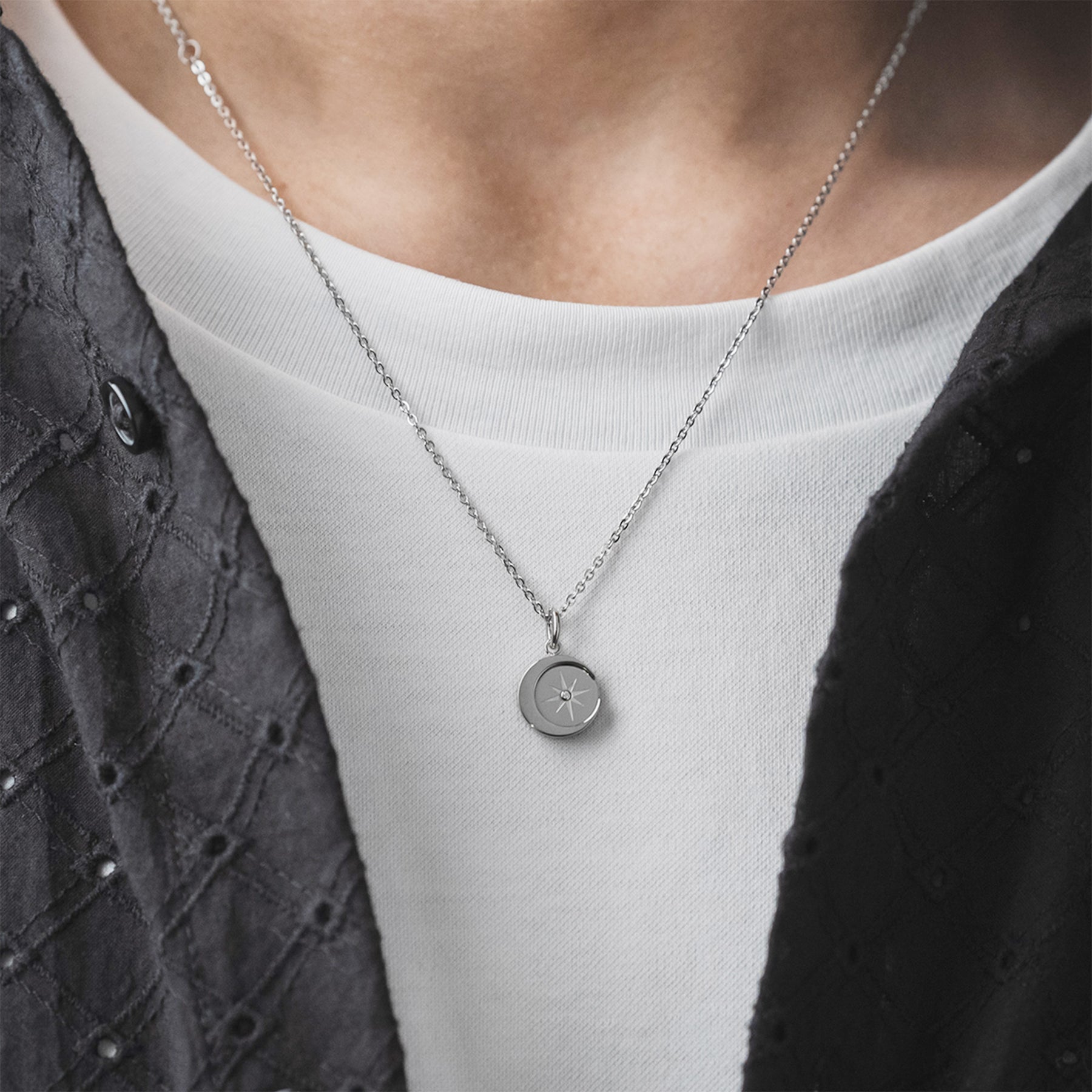 三日月と輝く星をモチーフにしたサークル型ペンダント。