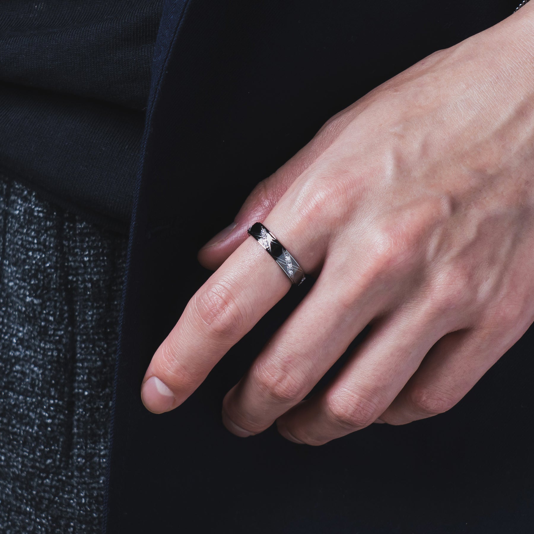 アーガイル調のクロスラインに、斜めに並ぶクリアストーンがさりげなく煌めくブラックリング。