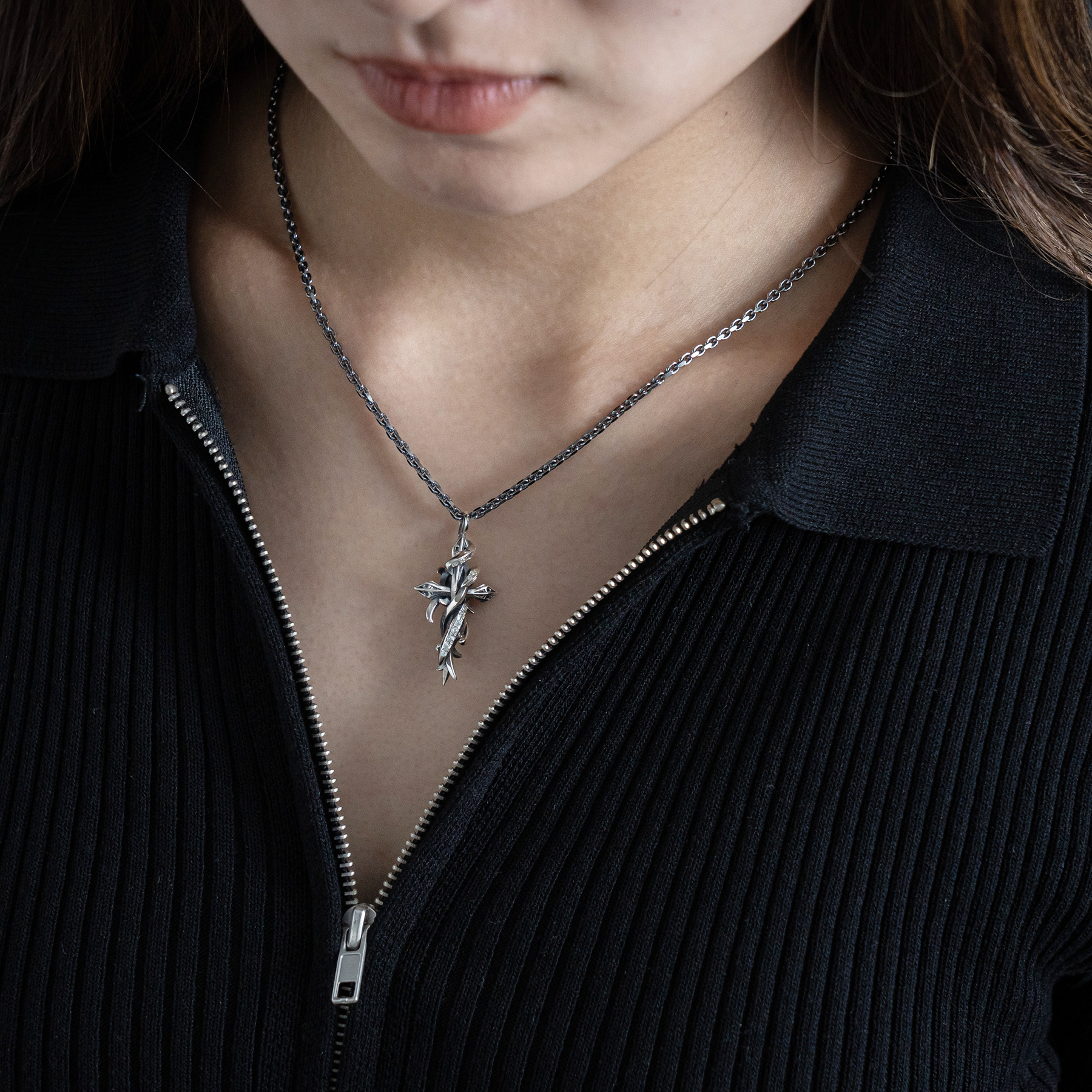 大胆かつ繊細なデザインが魅力のネックレス。TENTACLES(触手)が絡み合うクロスモチーフが、力強さと神秘的な雰囲気を演出します。シルバーの重厚感に加え、ライン状にあしらわれたストーンが華やかさをプラス。
