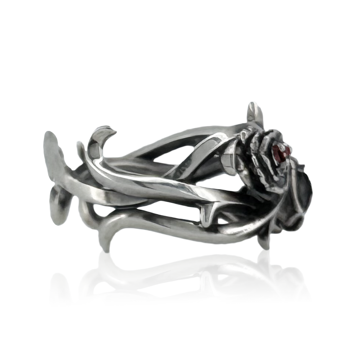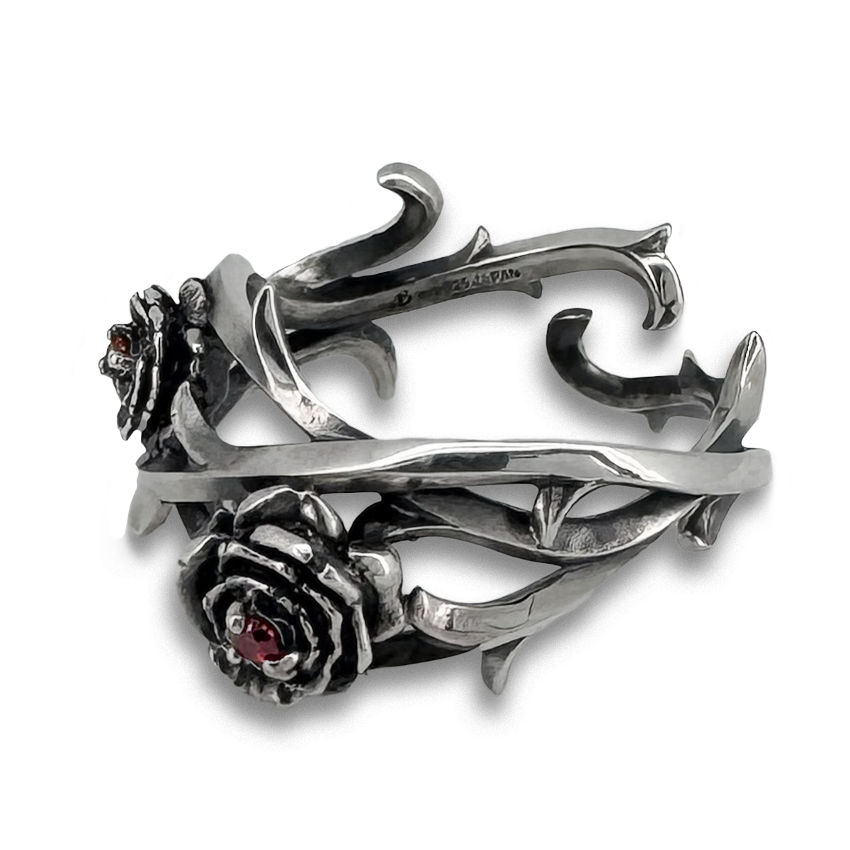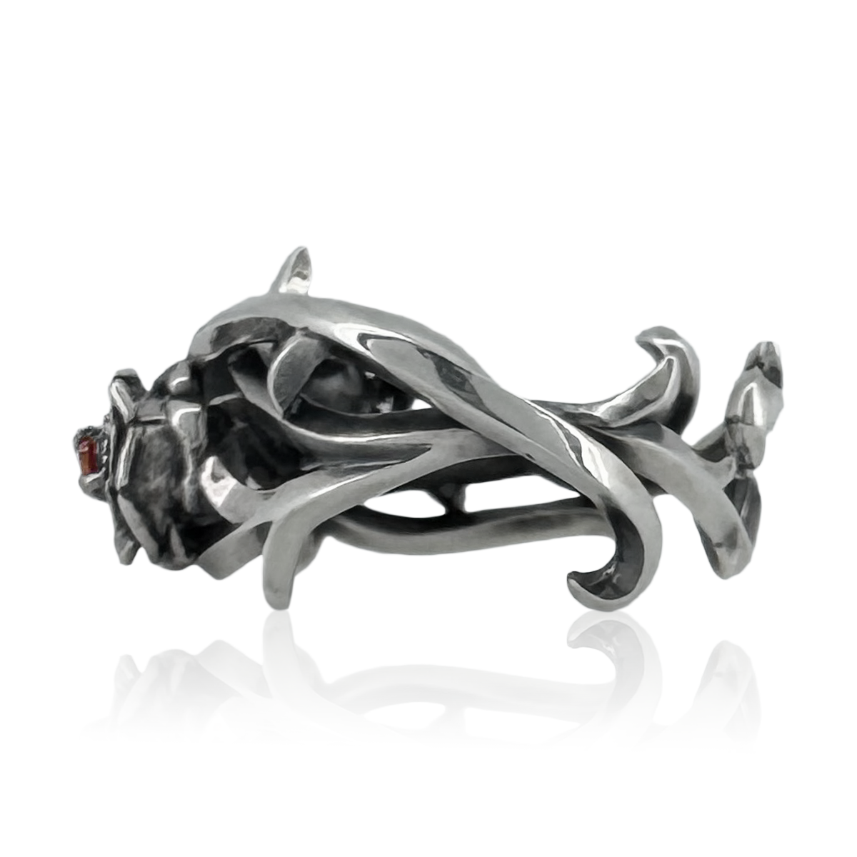 這款戒指的輪廓宛如兩朵尖銳而美麗的荊棘纏繞在手指上。兩朵玫瑰花中間鑲嵌著一顆寶石。