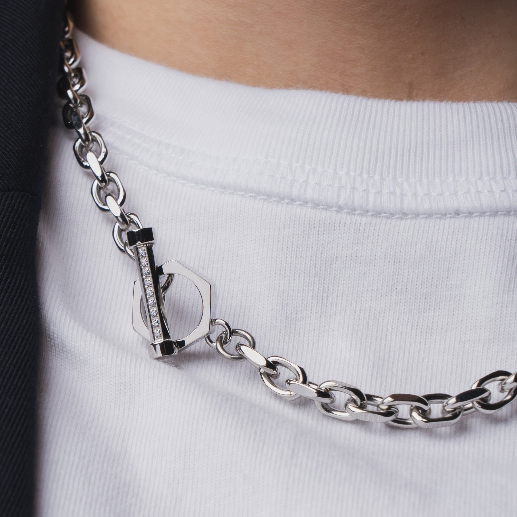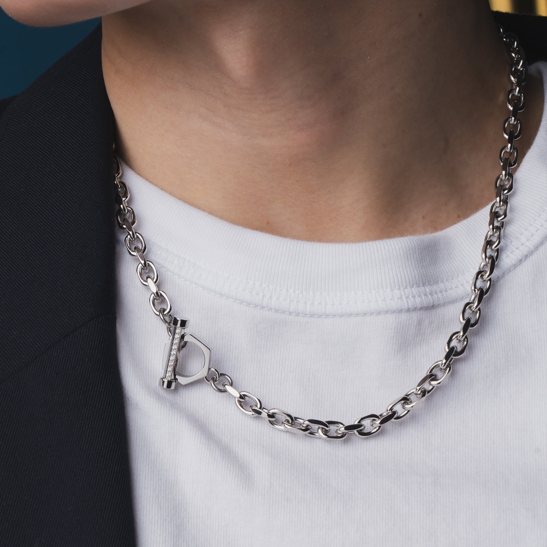 一條尺寸適中、造型優美的鍊式項鍊。工匠對鏈條進行切割和拋光,使其散發出高貴的光澤,再搭配隨意點綴的耀眼寶石,營造出一種精緻奢華的感覺。
