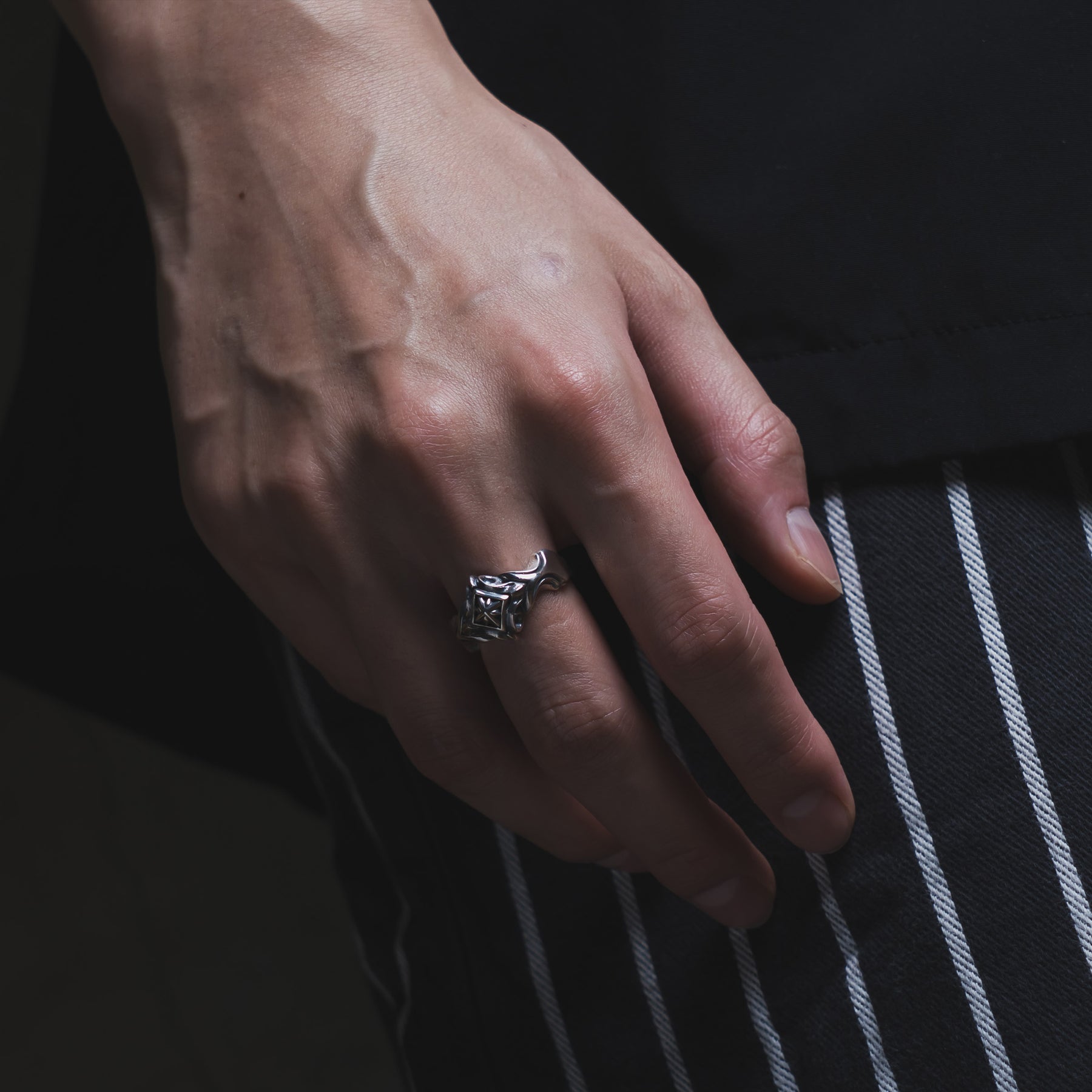 這款戒指的設計融合了流暢的曲線和銳利的棱角,其經典的裝飾賦予手指一種沉甸甸的質感。